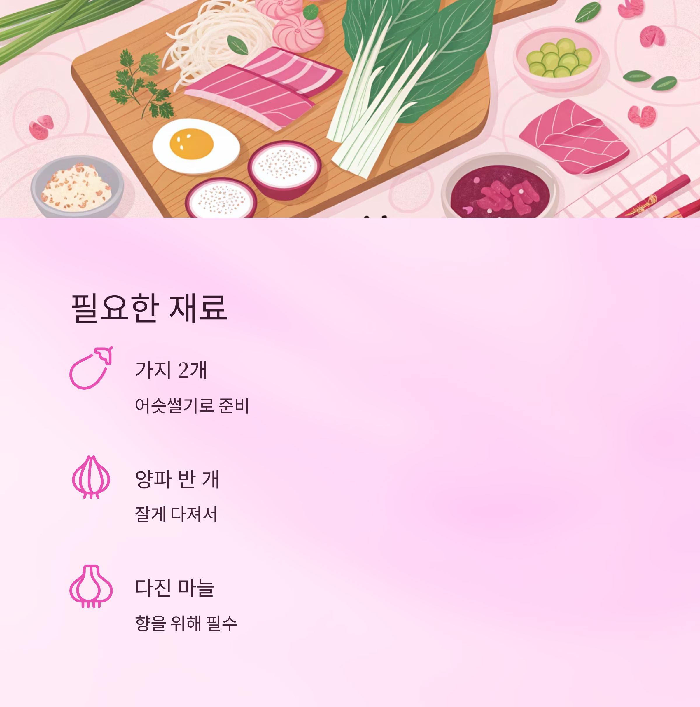 가지 2개, 양파 반 개, 다진 마늘, 간장, 설탕, 참기름, 깨소금, 밥 한 공기를 준비하면 기본 재료는 끝이에요. 여기에 고추나 청양고추를 추가하면 매콤한 맛을 살릴 수 있어요.