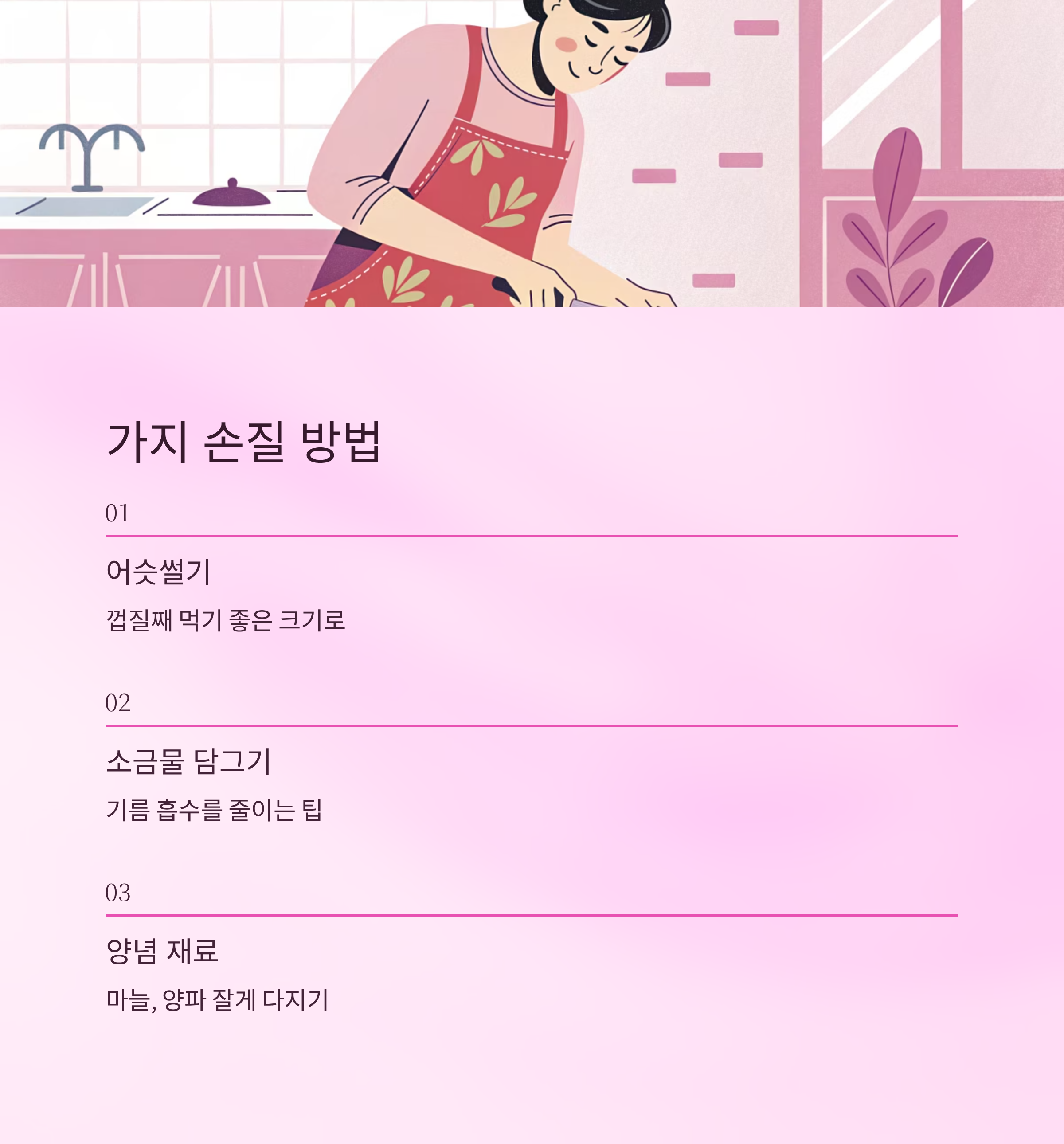 가지를 볶을 때 센 불에서 빠르게 조리하면 물컹해지지 않고 아삭한 식감을 유지할 수 있어요. 간장은 한 번에 넣지 말고 나눠 넣어야 간이 골고루 배요.