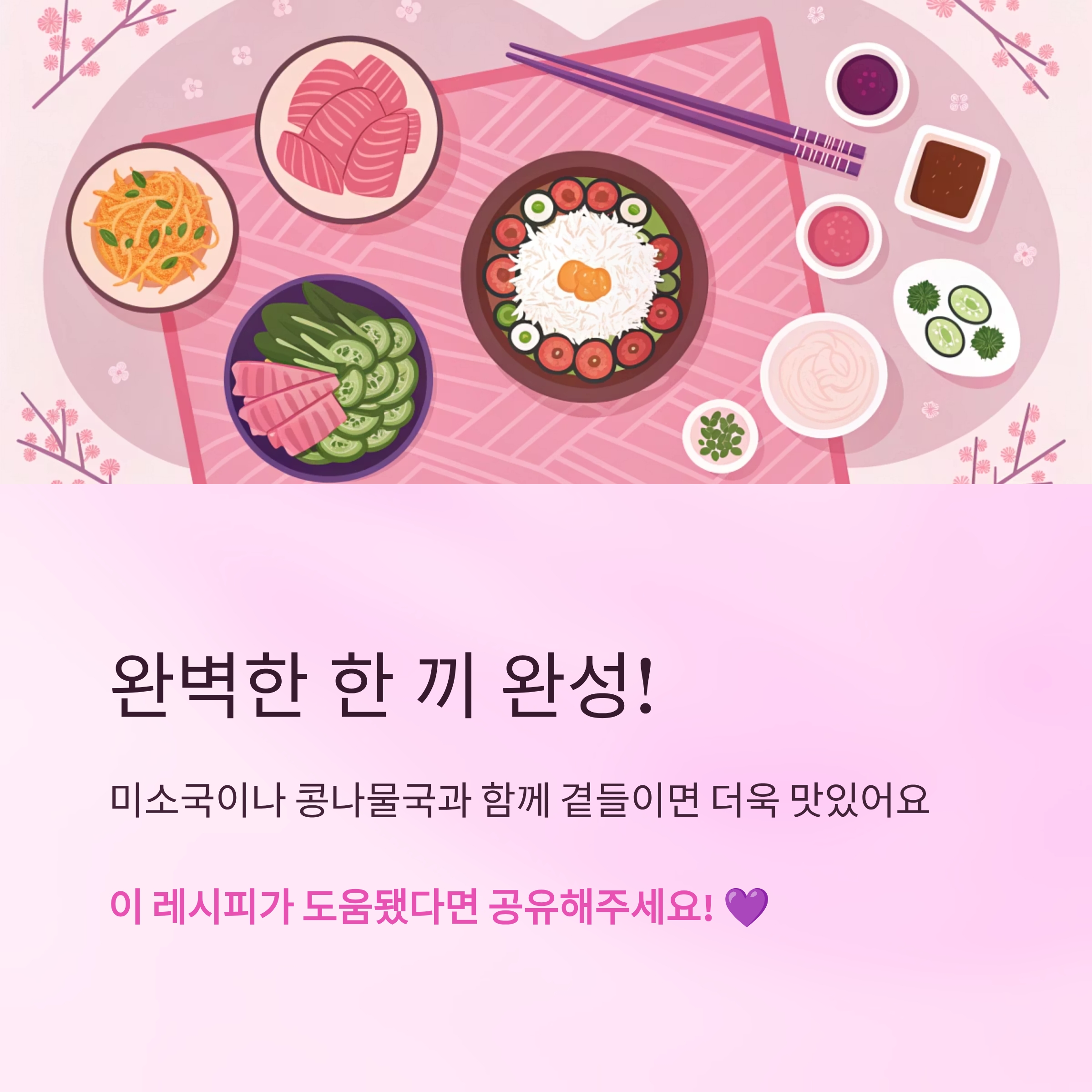 마지막에 넣는 참기름은 불을 끄고 나서 넣어야 향이 날아가지 않아요. 밥 위에 올릴 때 계란후라이를 곁들이면 부족한 단백질까지 보충할 수 있어 더욱 완성도 있는 한 끼가 돼요.