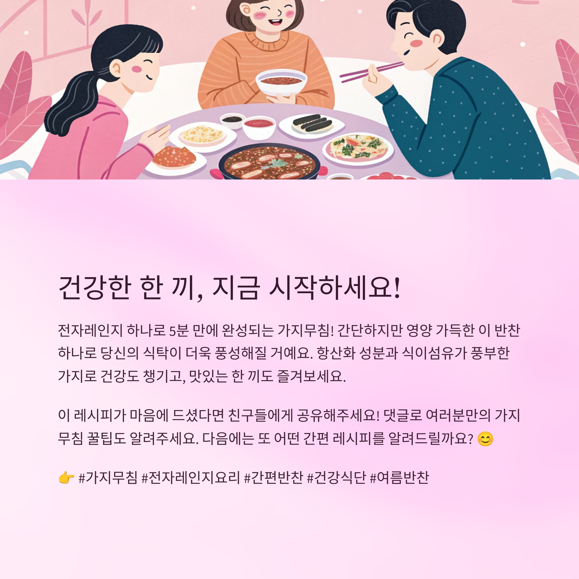 이처럼 가지는 단순한 반찬 이상의 가치를 지닌 건강 채소예요. 매일 먹어도 부담 없고, 다양한 방법으로 조리할 수 있기 때문에 식단에 자주 넣어보는 것도 좋아요. 특히 전자레인지를 이용한 가지무침은 영양을 그대로 살릴 수 있는 조리법 중 하나예요.🔥