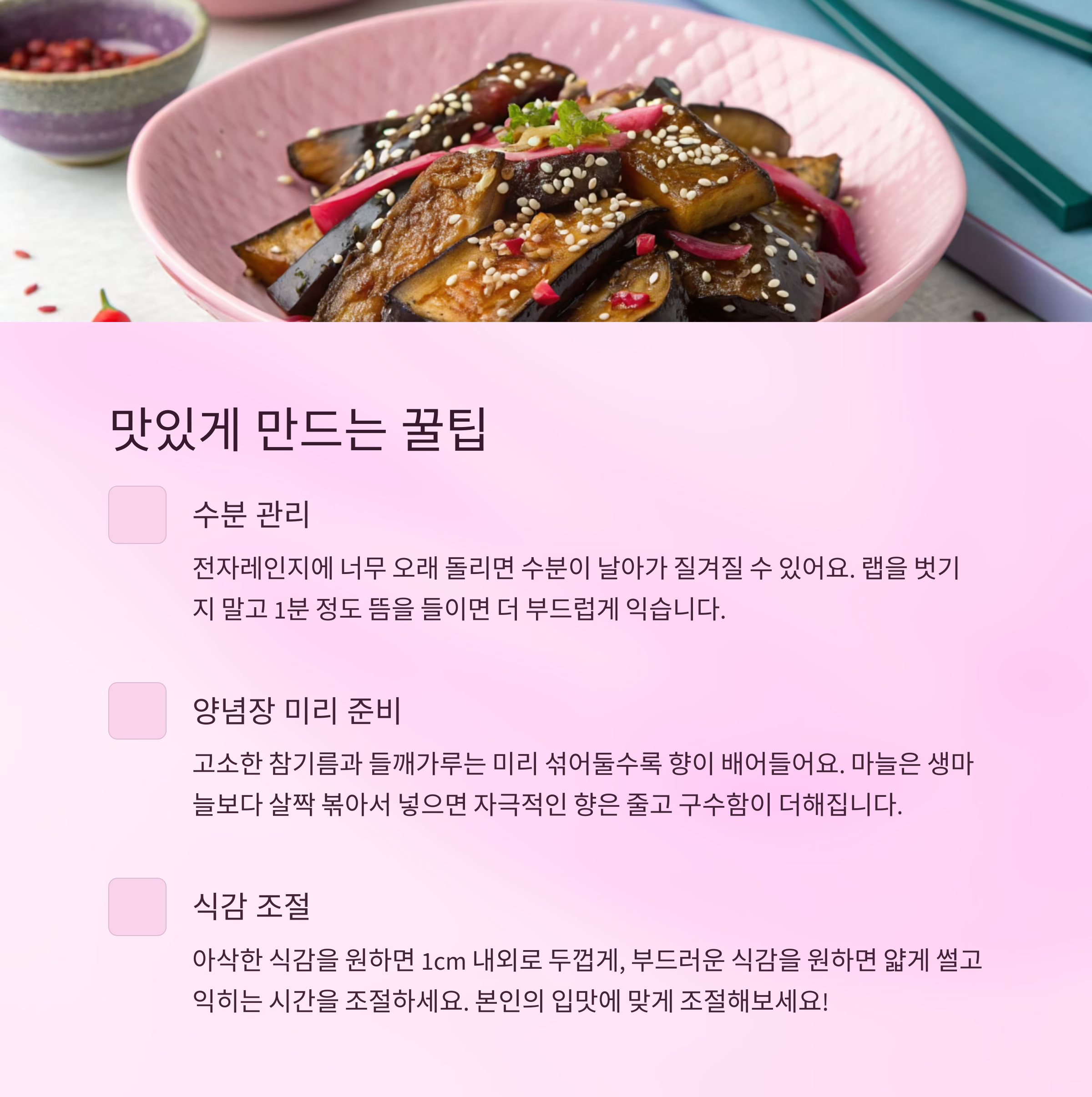 가지무침을 전자레인지로 만들면서도 한층 더 맛있게 만드는 방법이 있어요! 단순히 익히고 무치는 것을 넘어서, 식감과 풍미를 살리는 몇 가지 노하우를 알면 훨씬 맛이 살아나요.