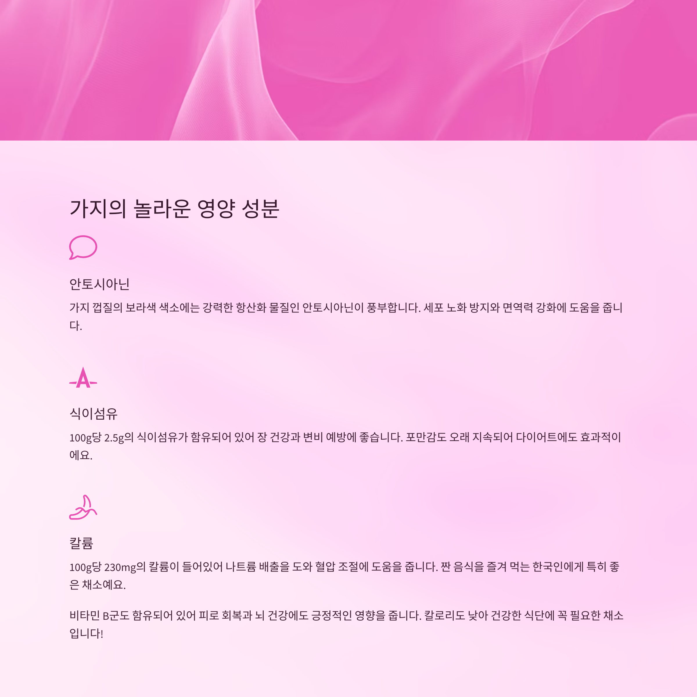 가지는 단순히 맛있는 채소가 아니라, 건강에도 정말 좋은 영양 덩어리예요. 가지의 보라색 껍질에는 ‘안토시아닌’이라는 강력한 항산화 물질이 풍부하게 들어 있어요. 이 성분은 세포의 노화를 방지하고, 면역력을 높이는 데 도움을 줘요.