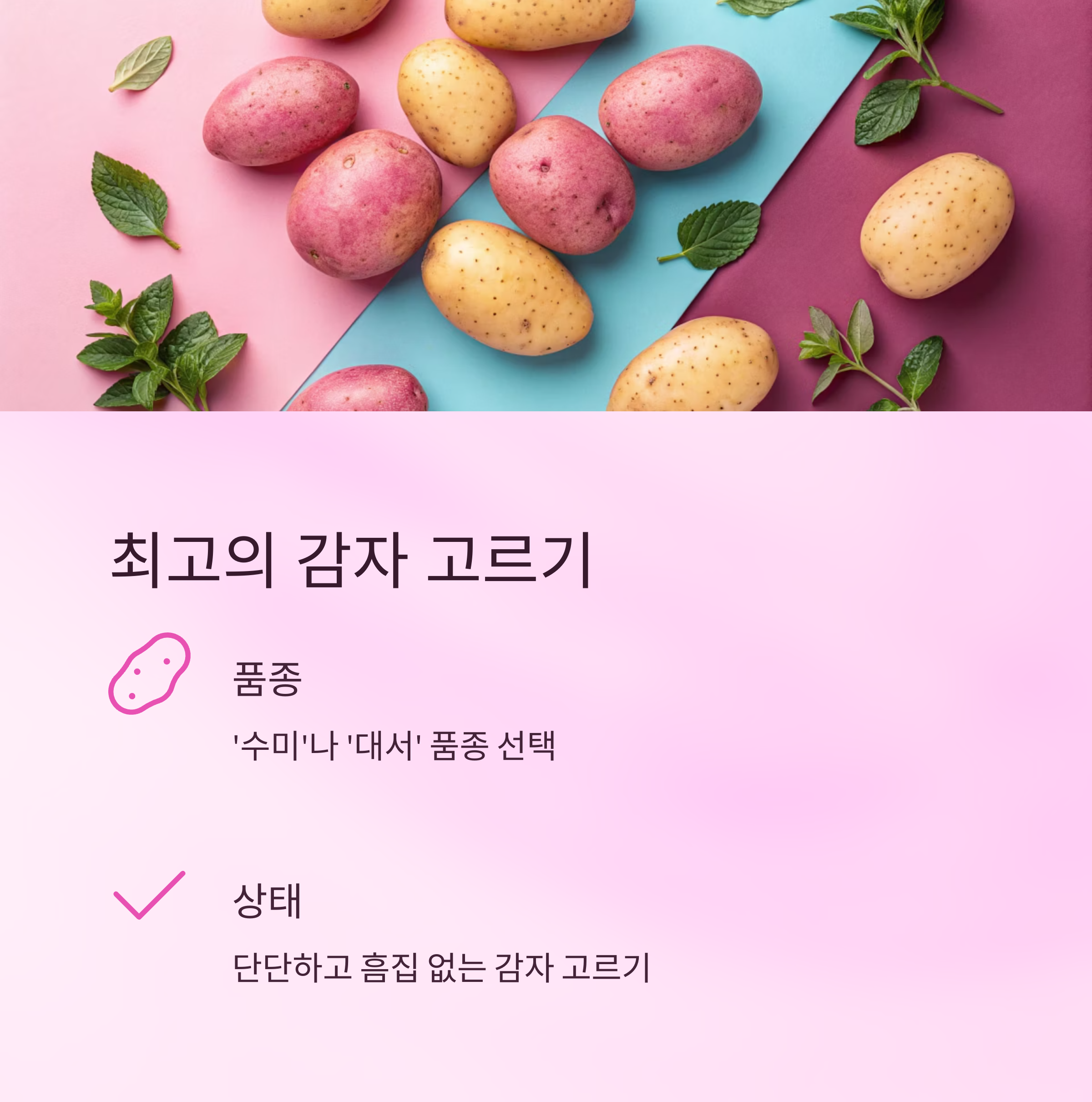 A3. ‘수미’나 ‘대서’ 같은 전분이 적당히 있는 감자가 좋아요. 너무 물 많은 감자는 부치기 어려워요.
