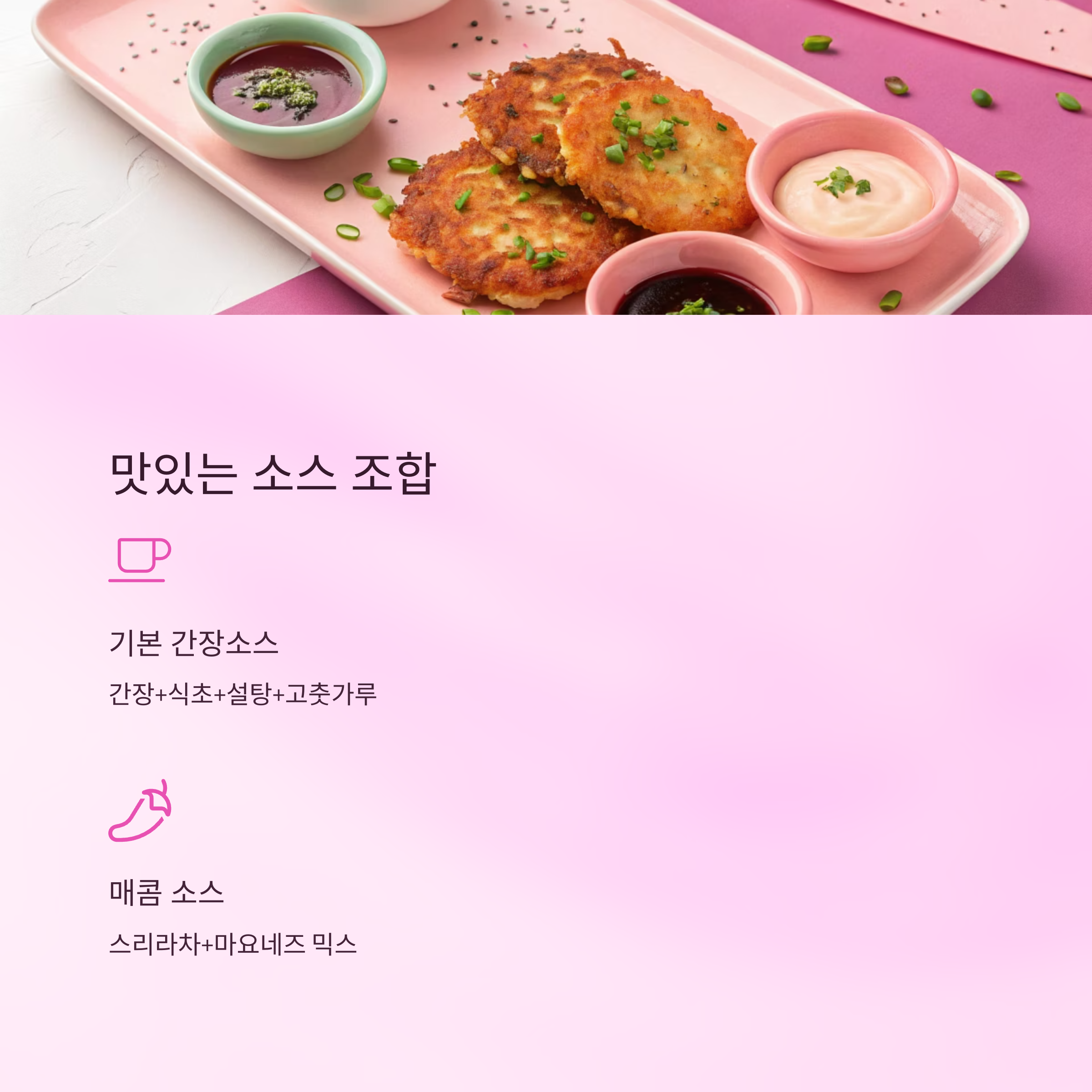 다양한 소스를 활용하면 같은 감자채전도 전혀 다른 느낌으로 즐길 수 있어요. 집에 있는 재료로 간단히 만들 수 있으니, 입맛 따라 바꿔보는 재미가 있어요!