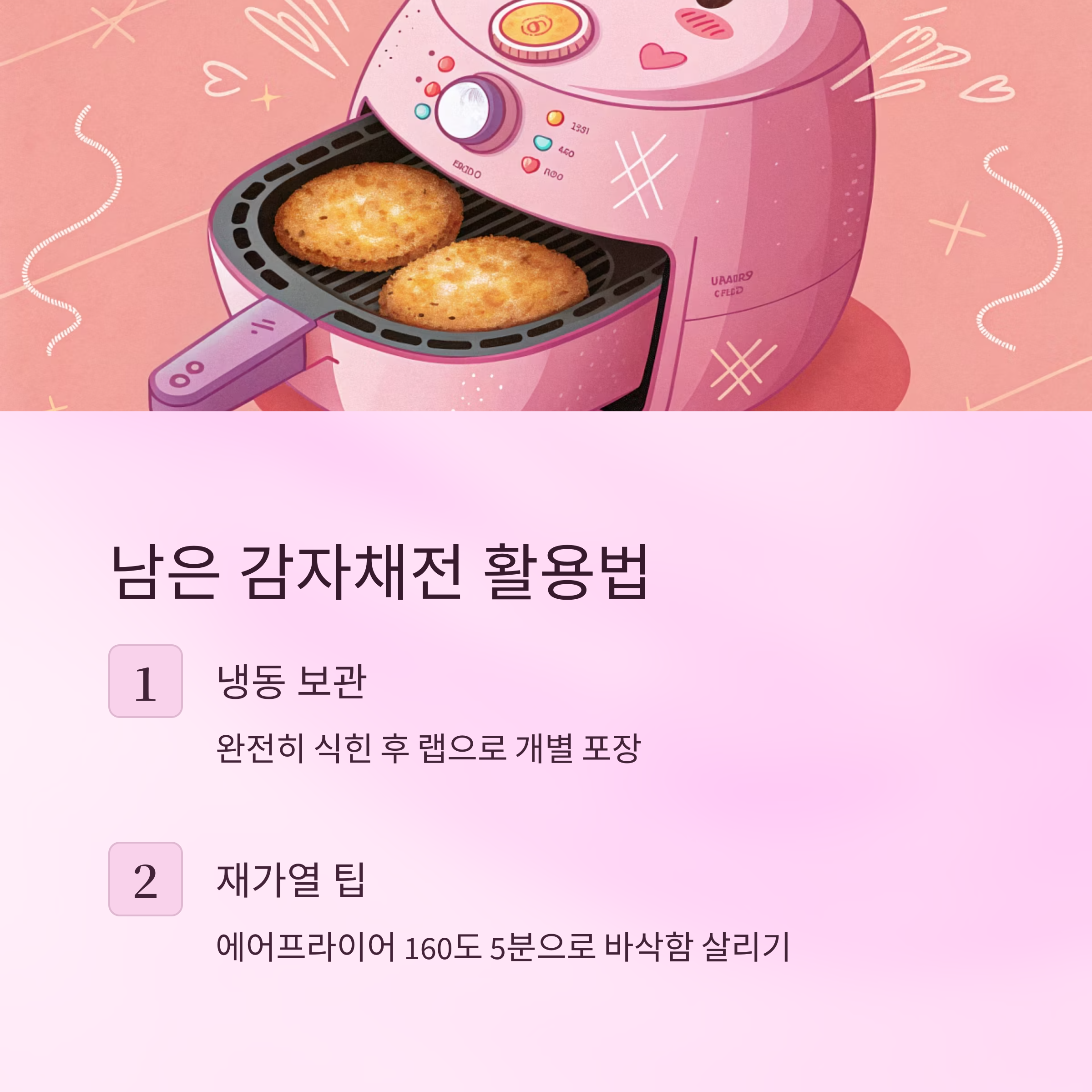| 냉동 보관 | 장기 보관 가능 | 해동 필요 | 에어프라이어 |