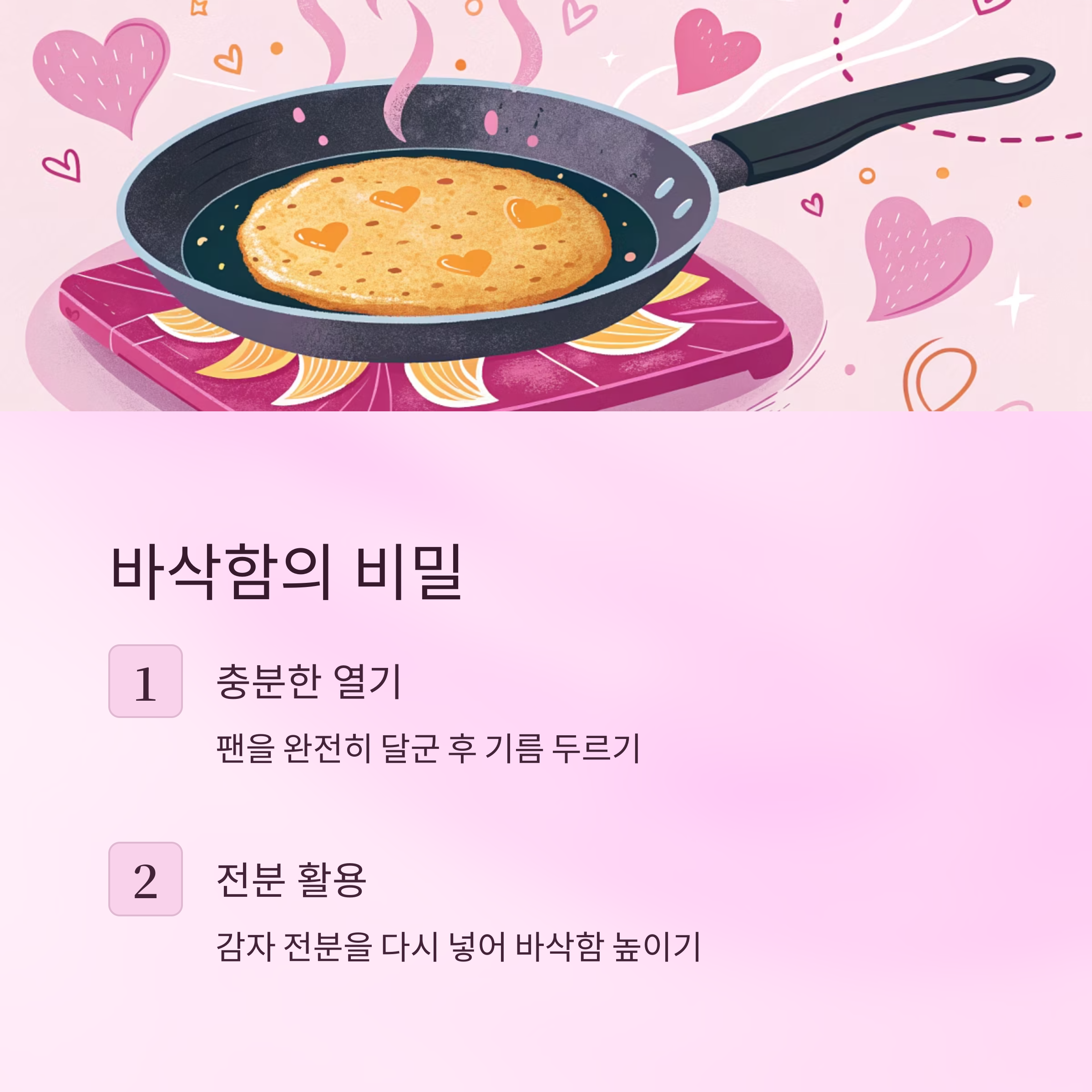 감자채전 만들기의 진정한 핵심은 단연 ‘바삭함’이에요. 겉은 바삭하고 속은 촉촉하게 구워내면, 그 어떤 반찬보다 손이 가는 메뉴가 되죠. 그러려면 몇 가지 포인트를 꼭 기억해야 해요.