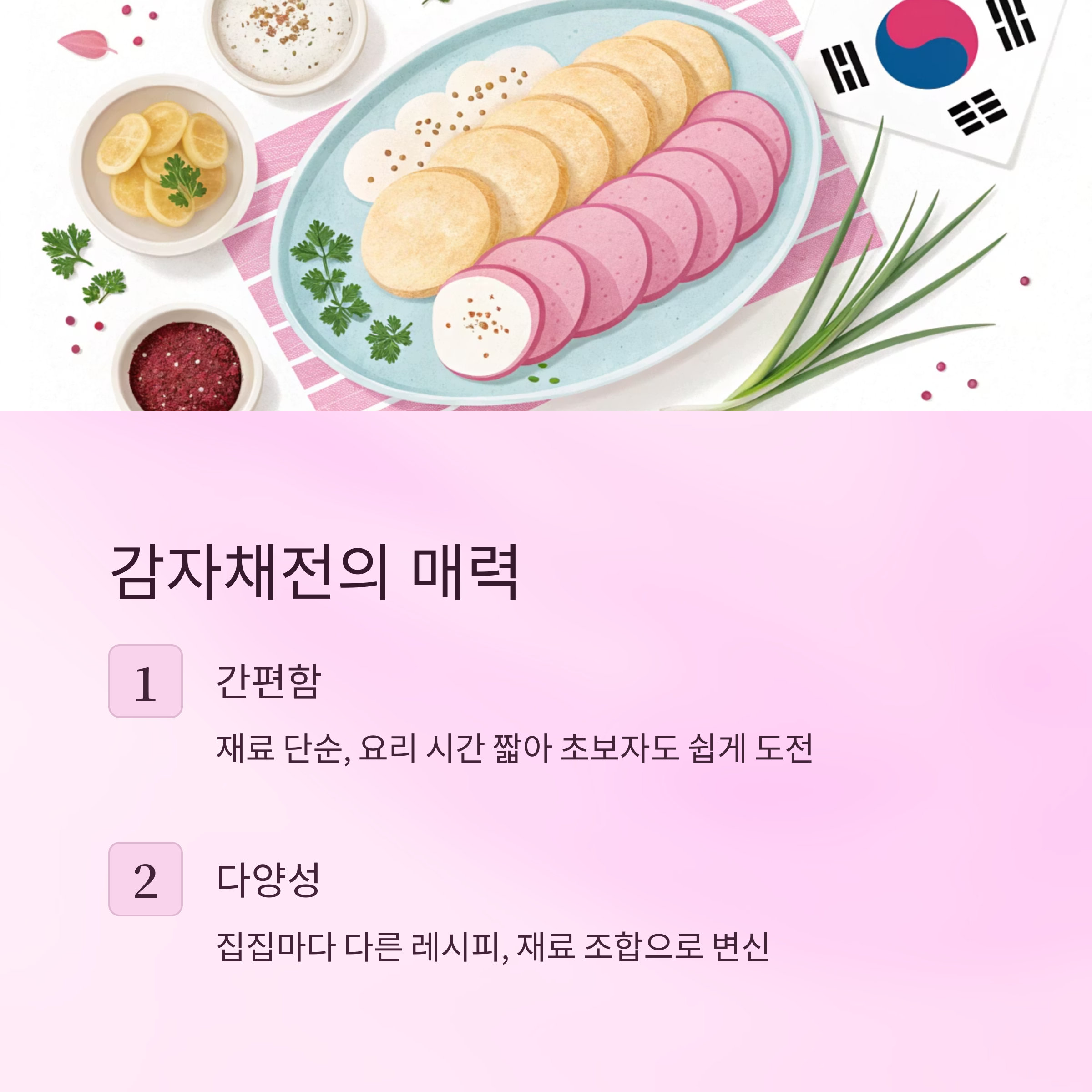 전통적으로는 명절에 다양한 전들이 올라왔지만, 요즘은 일상 반찬이나 간식으로 감자채전을 해먹는 집이 많아졌어요. 재료 준비가 간단하고, 조리 시간도 짧기 때문이죠. 무엇보다 튀김보다 기름이 적게 들고 담백해서 부담이 적어요.