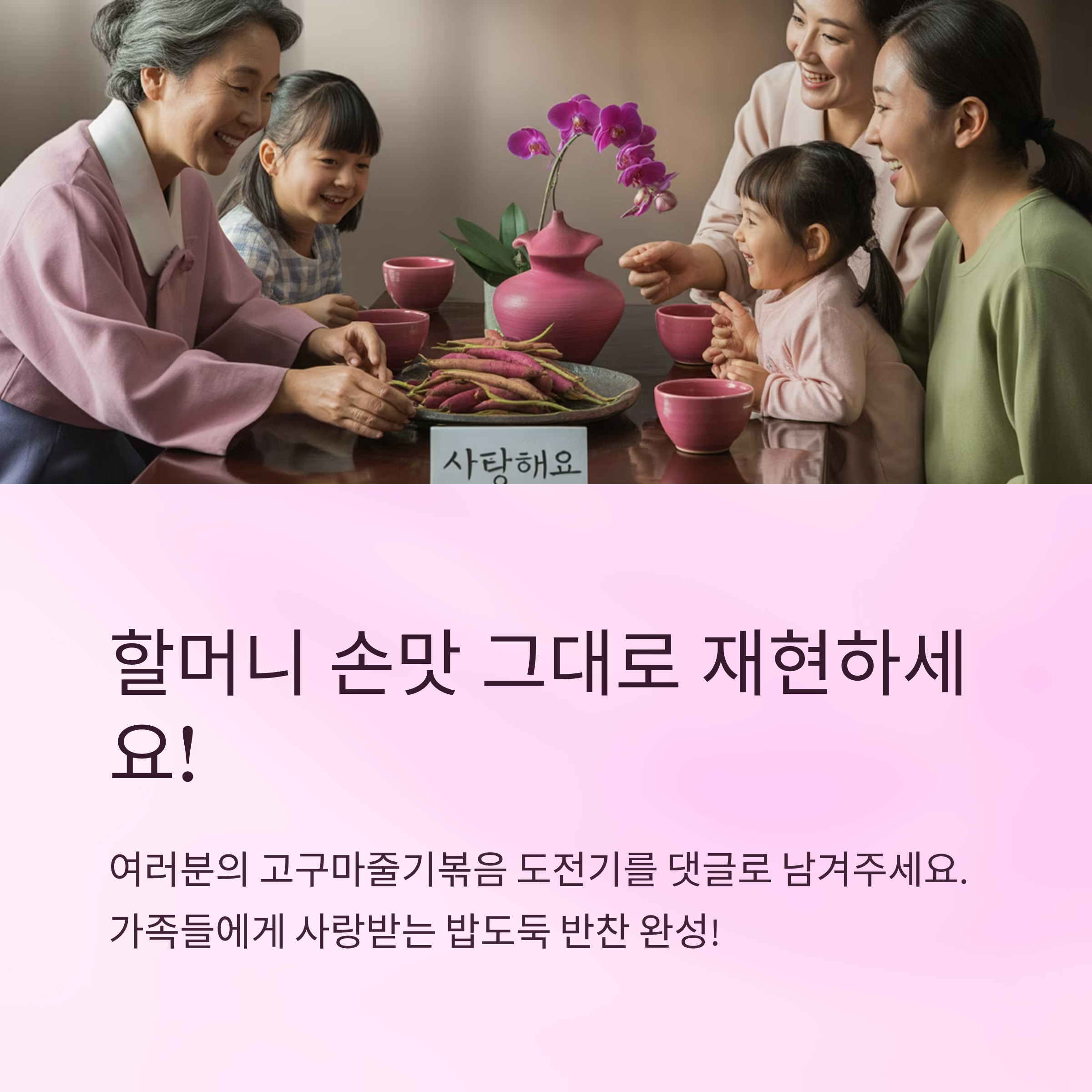 고구마줄기를 다듬고 데쳐내는 과정부터 볶음까지, 하나하나가 정성의 연속이에요. 삶는 시간, 간장 양, 들기름 비율까지 디테일이 결과를 크게 좌우해요. 저는 어릴 적 외할머니가 해주시던 경상도식 고구마줄기볶음을 생각하며 이 글을 쓰고 있어요. 나의 기억 속 그 맛을 재현하려 노력했답니다.