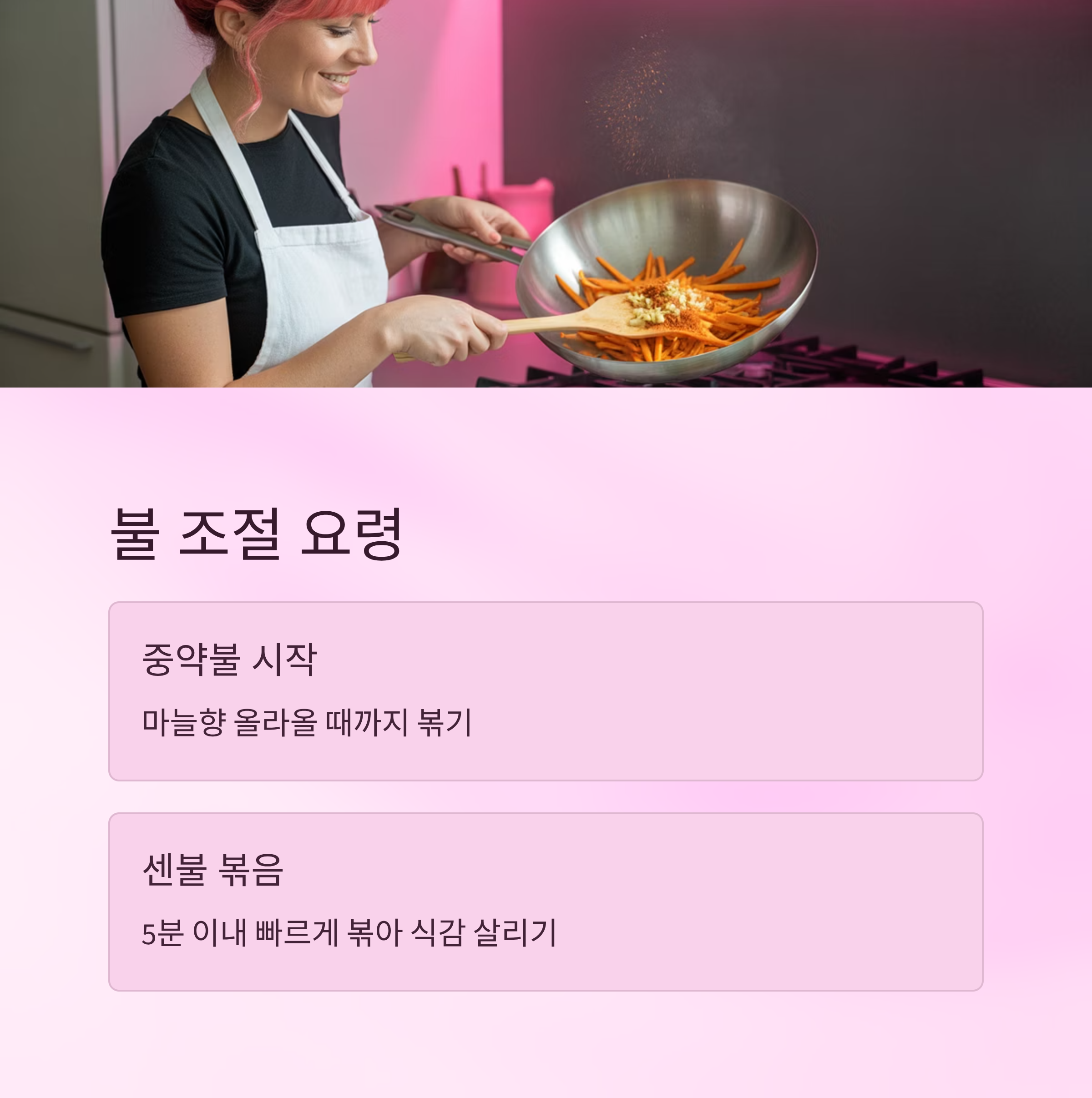 불 조절은 정말 중요해요. 너무 약하면 수분이 빠지지 않아 물컹해지고, 너무 세면 줄기가 타버릴 수 있어요. 전체적인 조리는 5분 이내로 끝내는 게 좋아요. 고구마줄기는 볶는 시간이 길면 질겨지거나 질감이 무너져요. 손질만 잘해두면 조리는 오히려 간단하답니다.