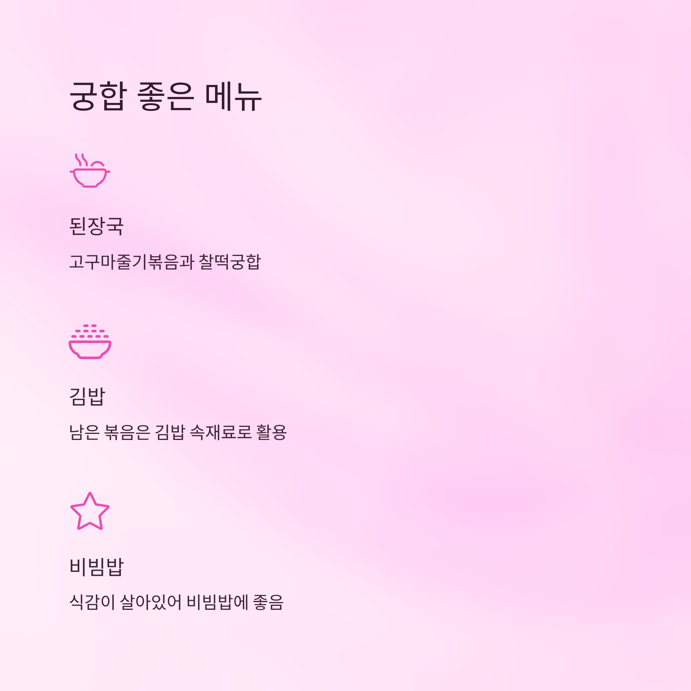 남은 고구마줄기볶음은 김밥 속 재료로도 활용 가능해요. 비빔밥에 넣으면 식감이 살아 있어 좋고, 계란말이 속에 넣으면 고소함이 배가돼요. 자투리 채소와 함께 볶아 고추장 넣고 제육볶음과 곁들이면 별미로 변신해요. 남은 반찬을 지혜롭게 쓰는 건 엄마들의 생활 지혜죠!