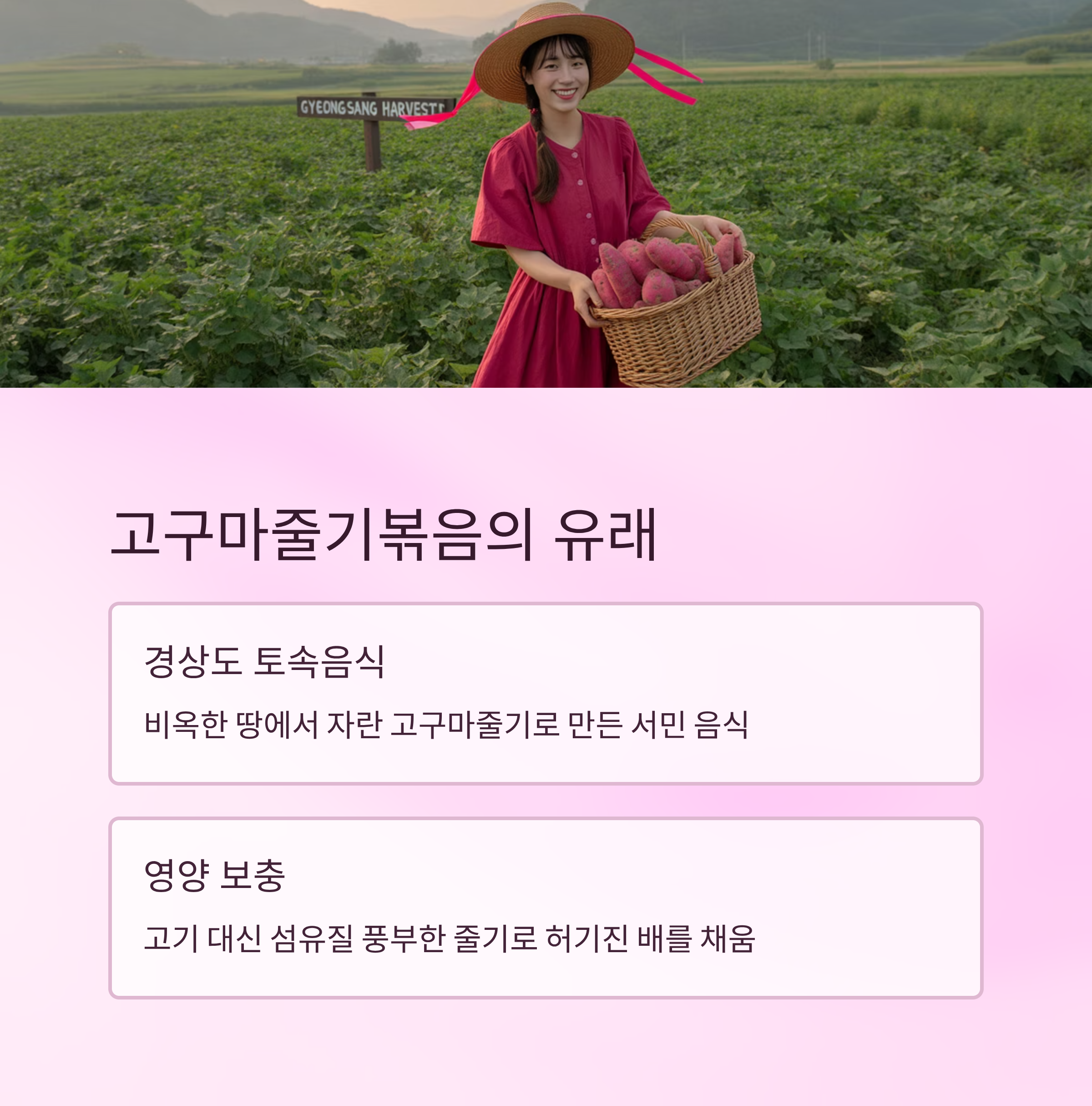 경상도 지방은 예로부터 땅이 비옥하고 농사가 잘 되던 지역이에요. 고구마 재배도 활발해서 고구마줄기를 활용한 음식이 다양하게 발전했죠. 여름철에 한창 자라는 고구마줄기를 삶아 보관해 두었다가 겨울에도 먹는 문화가 있었어요. 특히 가을 수확기에 말려서 저장하거나, 바로 삶아서 양념해 볶아먹는 경우가 많았어요.