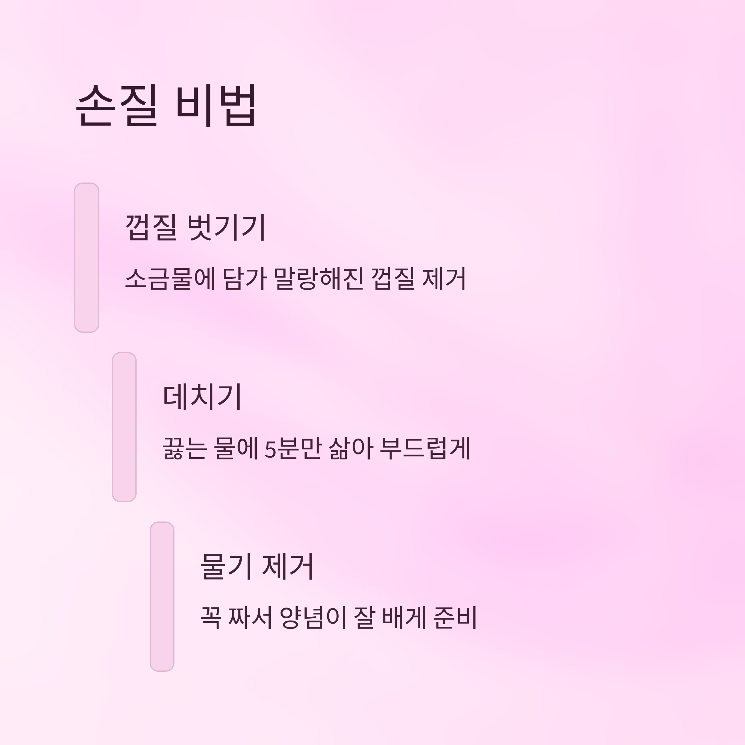 A1. 물에 30분 정도 담가두면 껍질이 말랑해져서 벗기기 쉬워져요. 소금물도 좋아요.