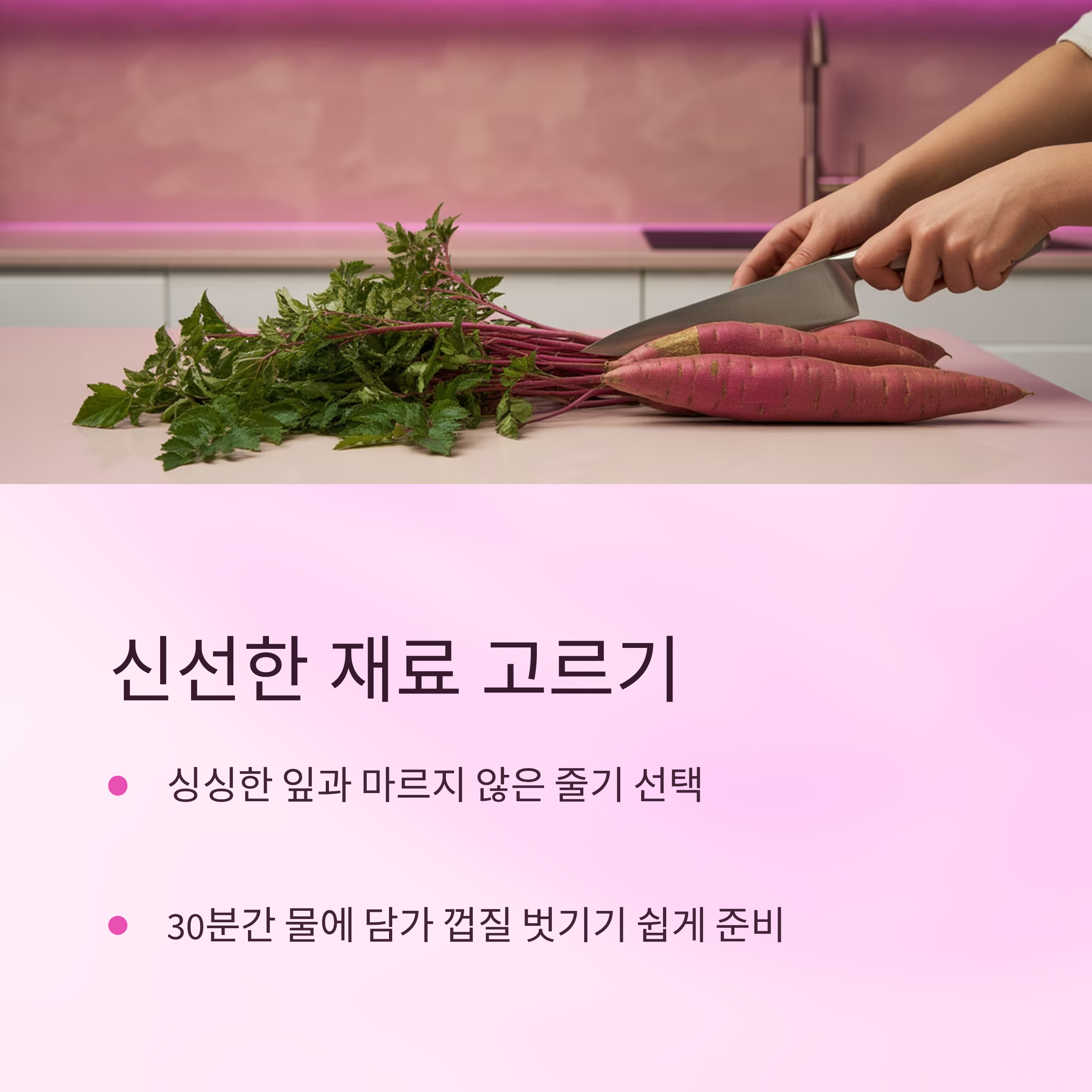 고구마줄기는 섬유질이 많아서 손질이 까다로운 편이에요. 껍질을 하나하나 벗겨내야 하고, 그대로 삶으면 질겨서 식감이 좋지 않아요. 신선한 줄기를 고르는 게 무엇보다 중요해요. 잎이 싱싱하고 줄기가 마르지 않은 것을 고르면 좋아요. 삶기 전에 30분 정도 물에 담가두면 껍질이 잘 벗겨진답니다.