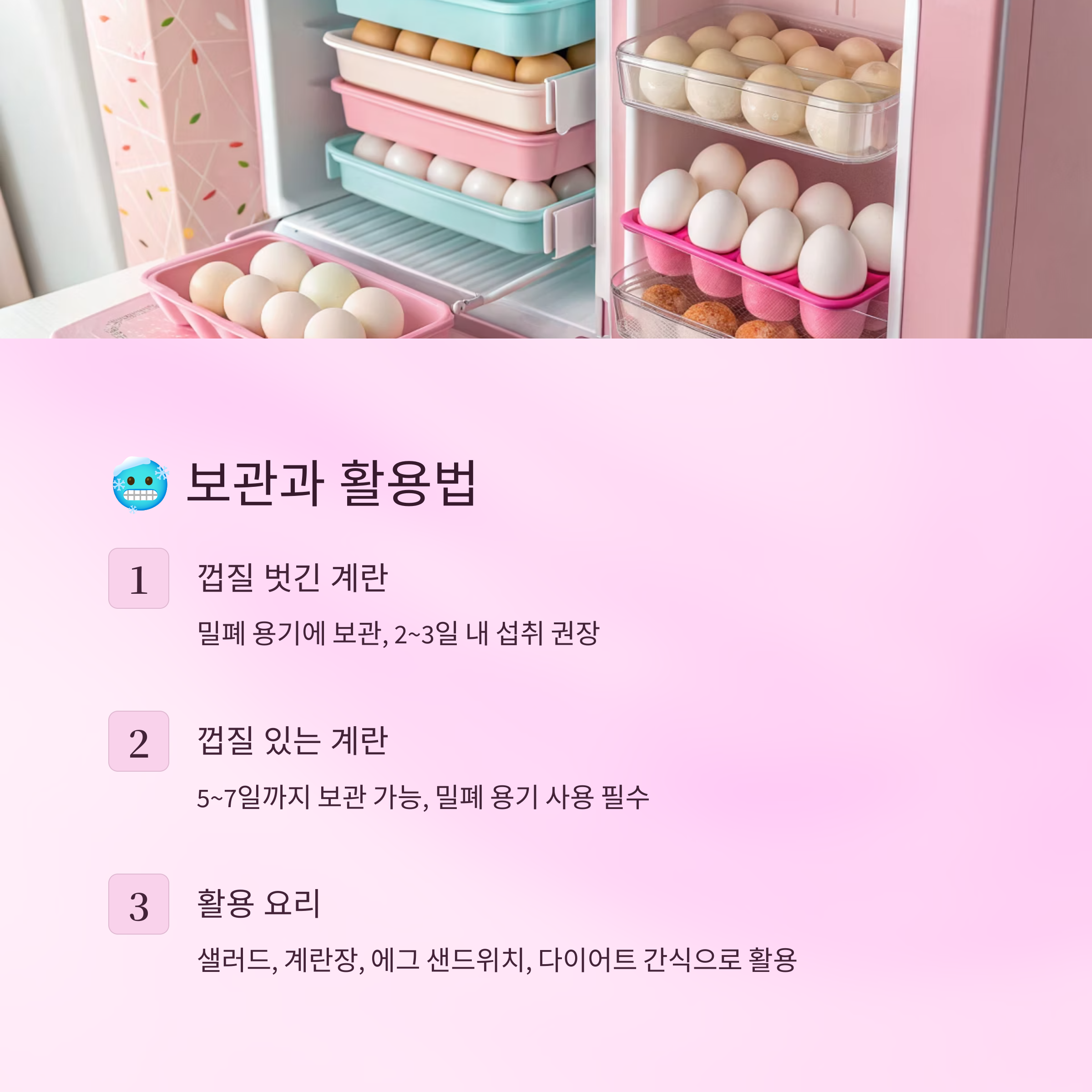 삶은 계란은 보관 방법에 따라 맛과 식감이 크게 달라져요. 껍질을 깐 경우에는 냉장 보관 시 수분이 쉽게 날아가기 때문에 밀폐 용기에 보관해야 하고, 2~3일 이내 섭취하는 게 가장 좋아요.