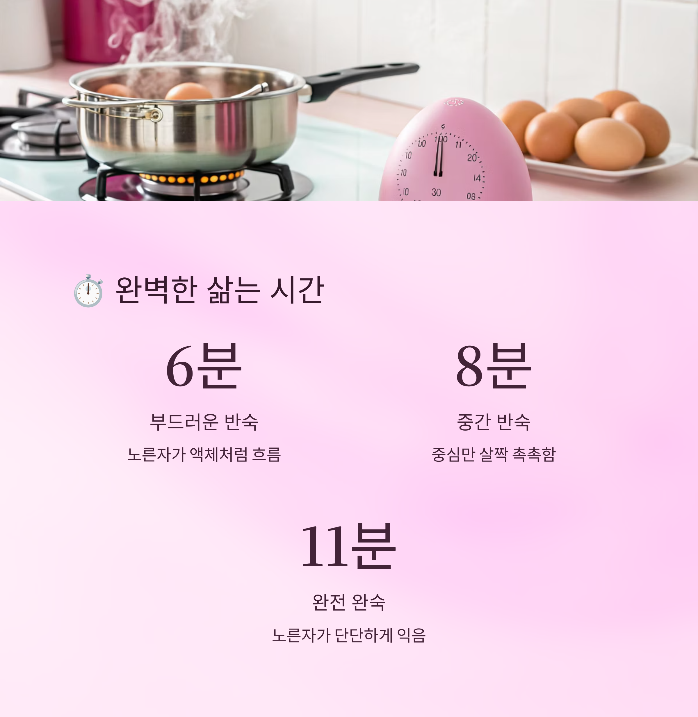 - 11~12분: 완숙, 노른자가 단단하게 익음