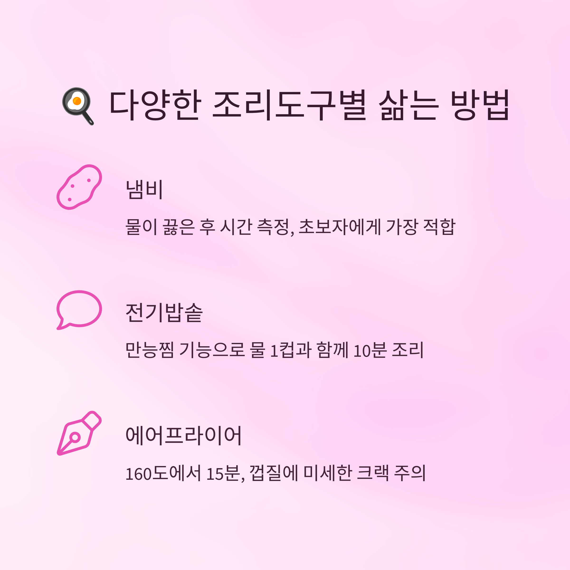 가장 일반적인 냄비는 삶는 시간을 정확히 조절할 수 있어 초보자에게 적합해요. 물이 끓고 나서 타이머를 맞추는 방식이라 익힘 정도를 쉽게 조절할 수 있답니다. 단점은 가스레인지에 계속 주의를 기울여야 한다는 점이에요.