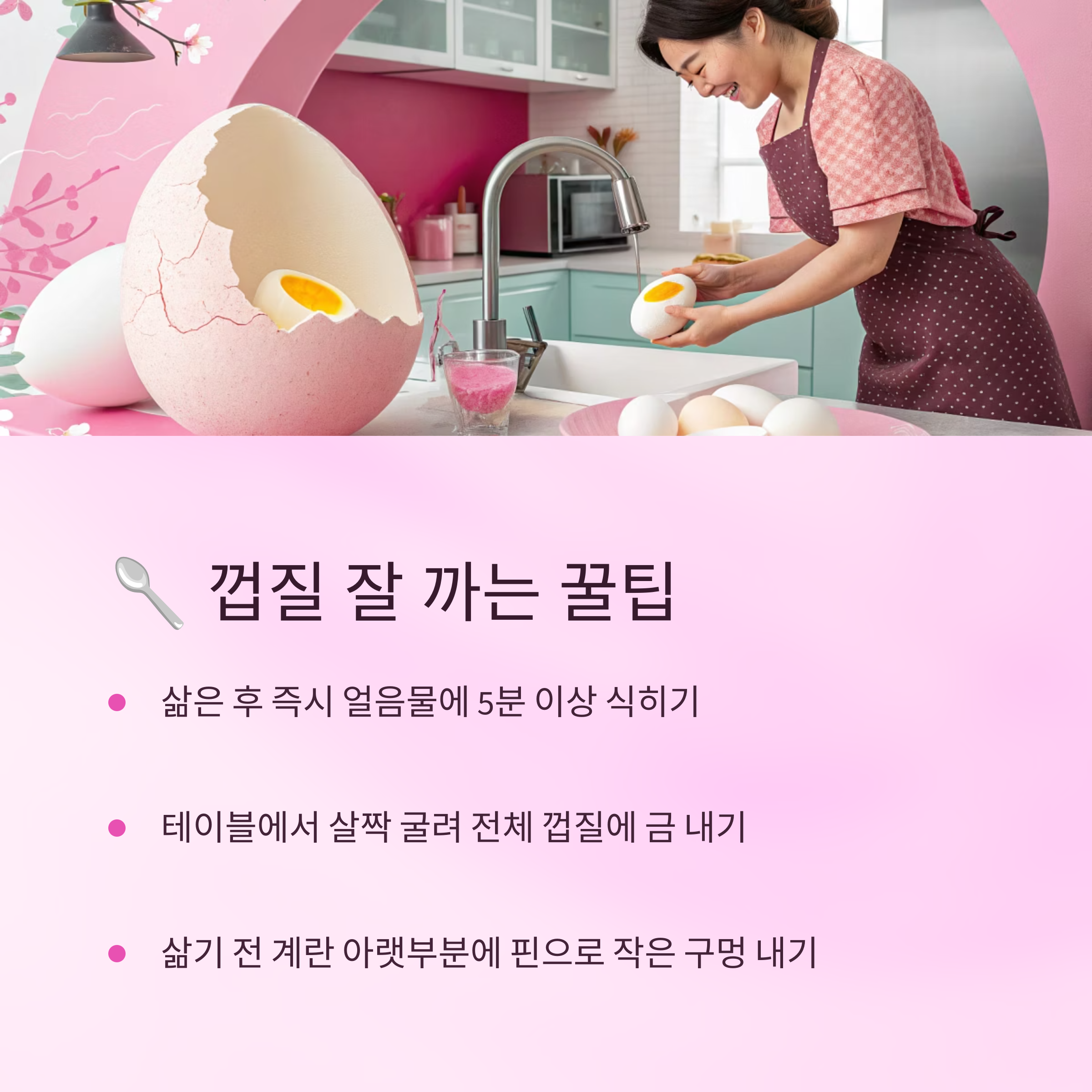 계란을 삶은 후 바로 찬물에 5분 이상 담그고, 껍질 쪽에 작은 금을 살짝 내준 뒤 테이블 위에서 굴리듯 깨면 껍질이 쉽게 벗겨져요. 또 삶기 전 계란 아랫부분에 핀으로 아주 살짝 구멍을 뚫는 방법도 있어요. 내부 공기가 빠지면서 껍질이 더 잘 까지게 된답니다.