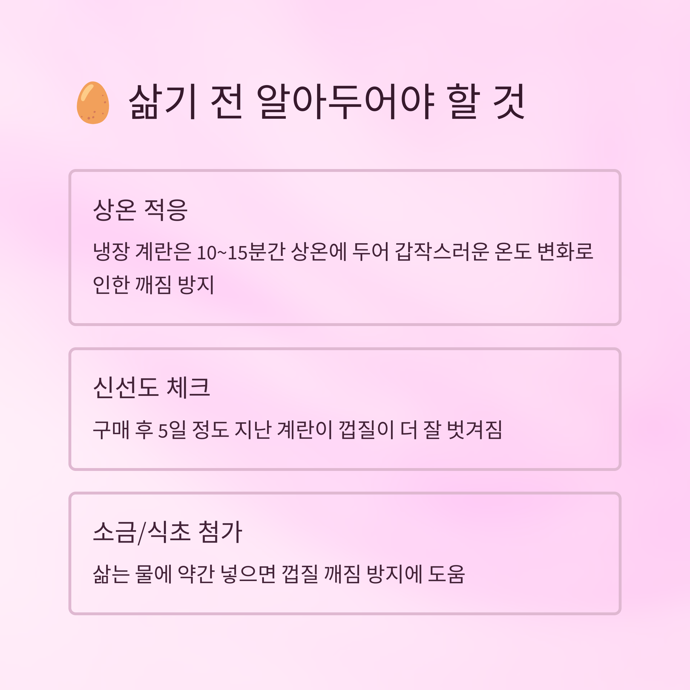 🥚계란 하나 잘 삶는 게 뭐 그리 대단한 일이냐고요? 하지만 삶아보면 압니다. 껍질이 잘 안 까지거나 노른자가 반쯤 익은 채로 나와 당황한 적, 다들 한 번쯤은 있지 않나요?