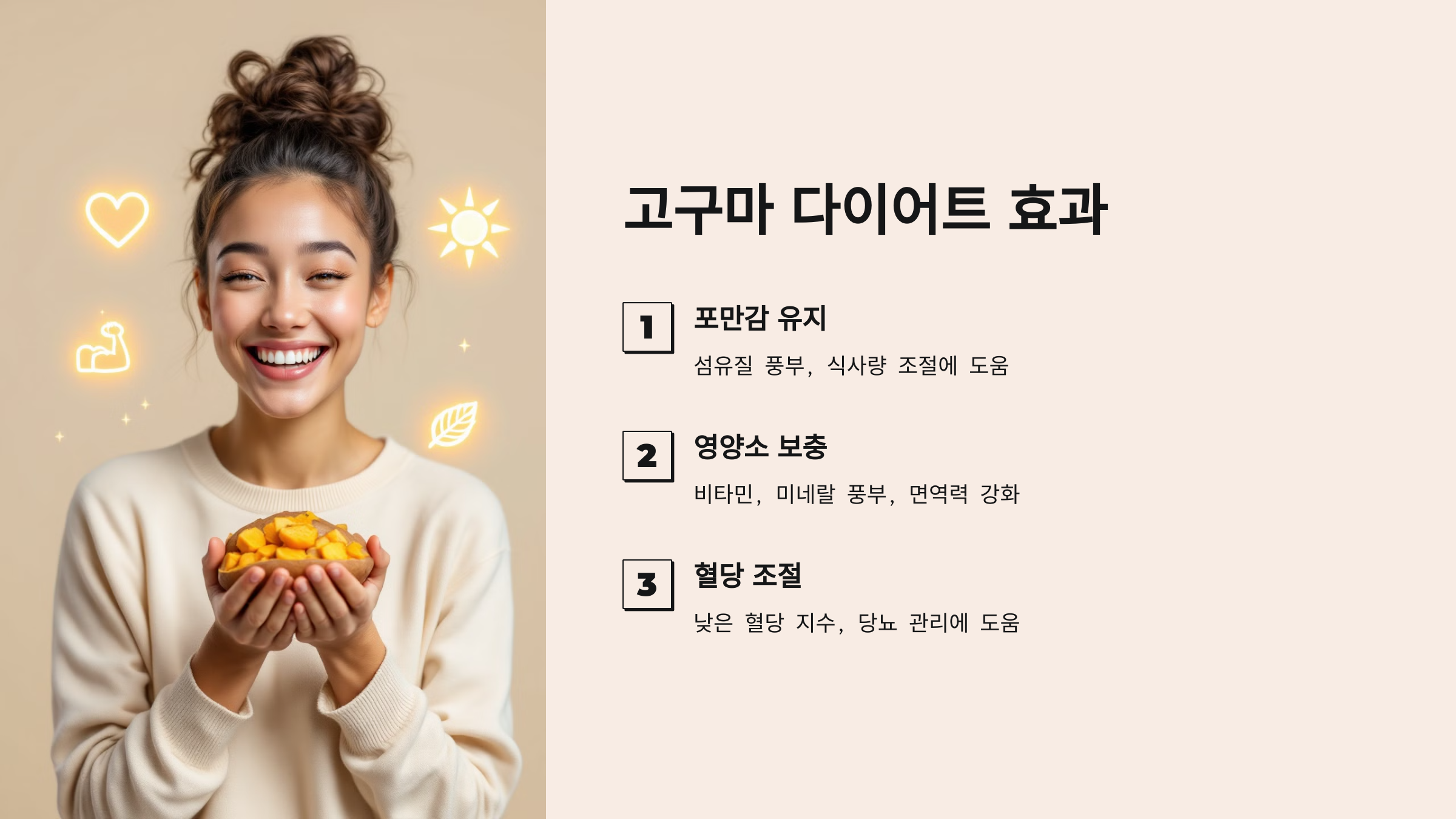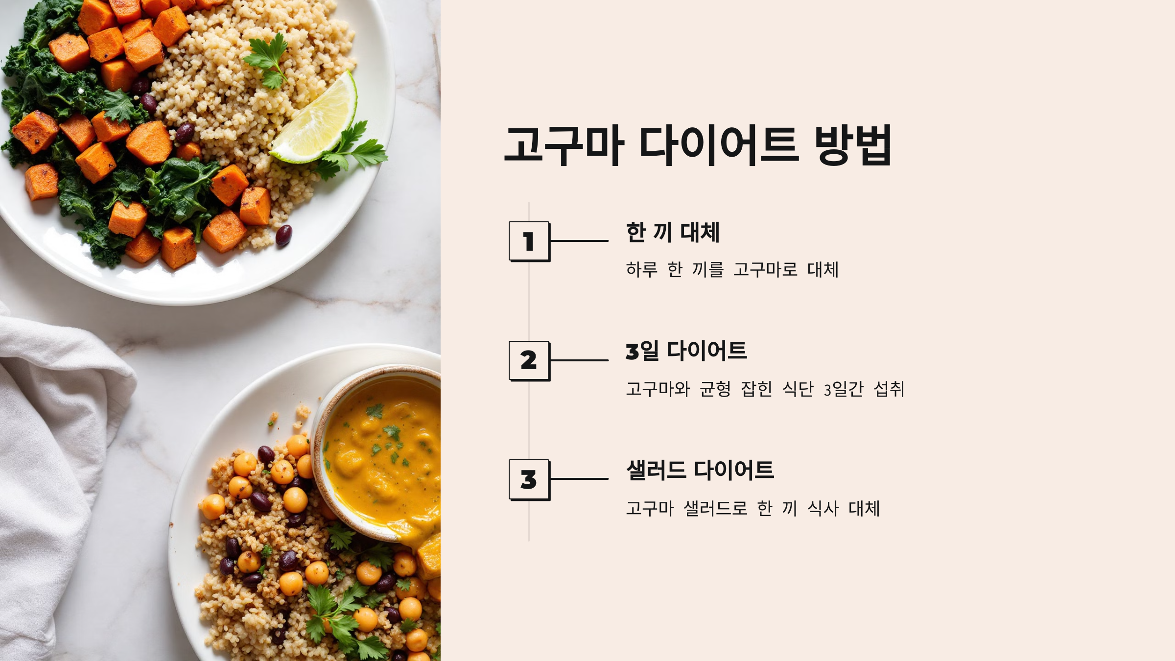 - 방법: 하루 세 끼 중 한 끼를 고구마로 대체합니다. 예를 들어 아침을 고구마와 삶은 달걀, 그릭 요거트 등으로 구성하여 포만감과 영양을 동시에 섭취할 수 있습니다.