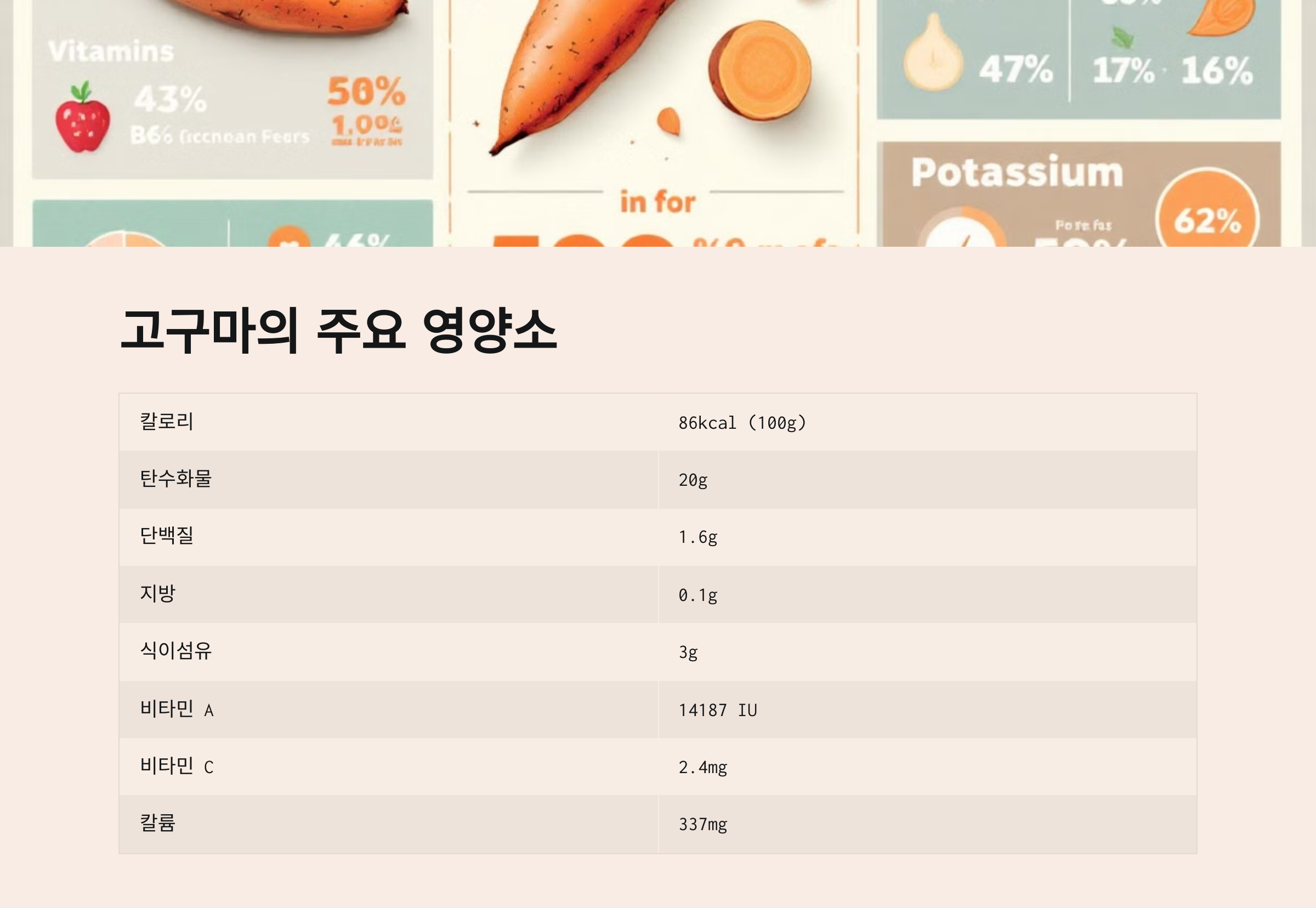 고구마는 다양한 영양소를 골고루 포함하고 있어 종합 비타민처럼 활용될 수 있습니다. 여기서 고구마 100g당 평균적인 영양 성분을 알아보겠습니다.