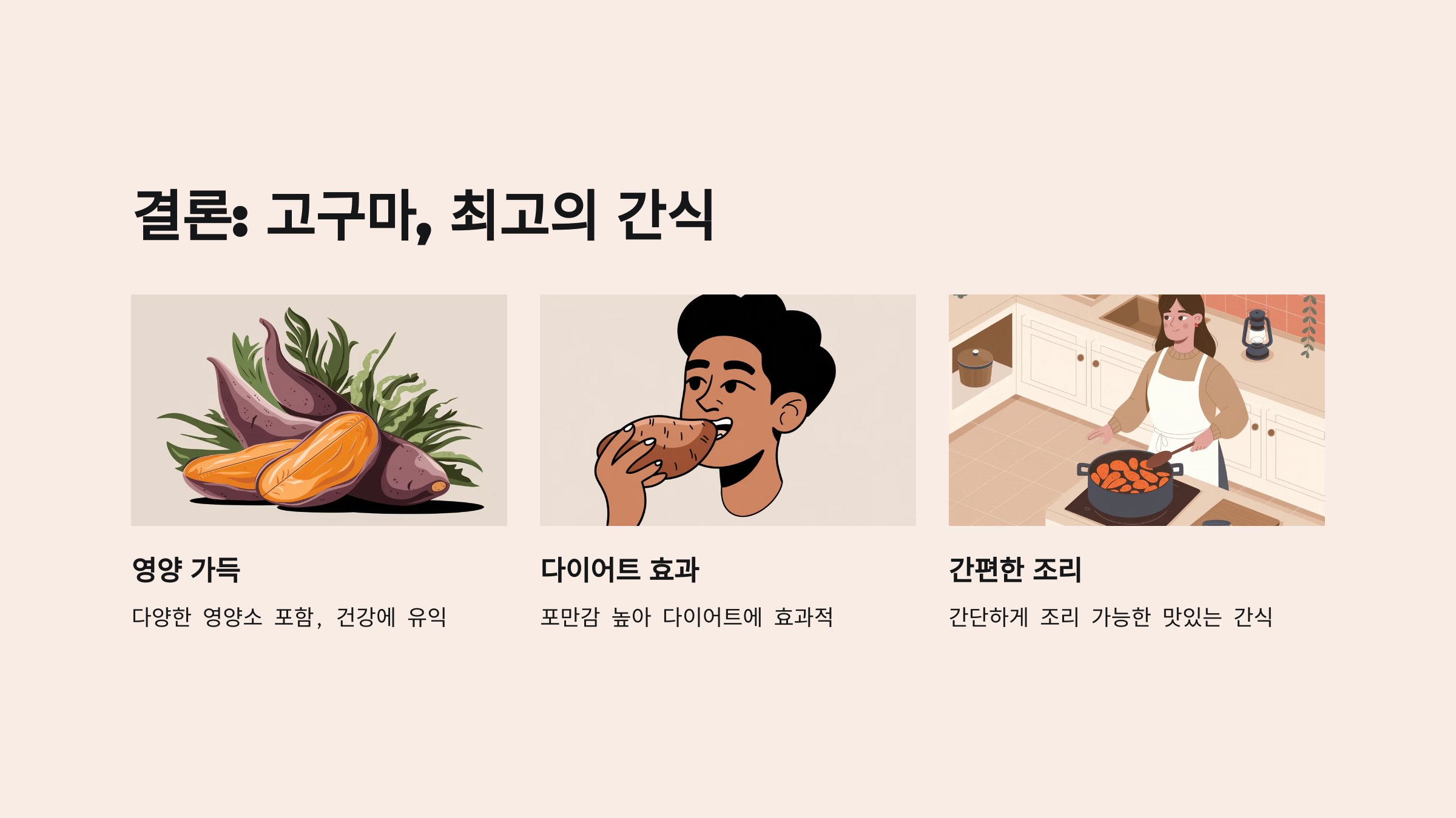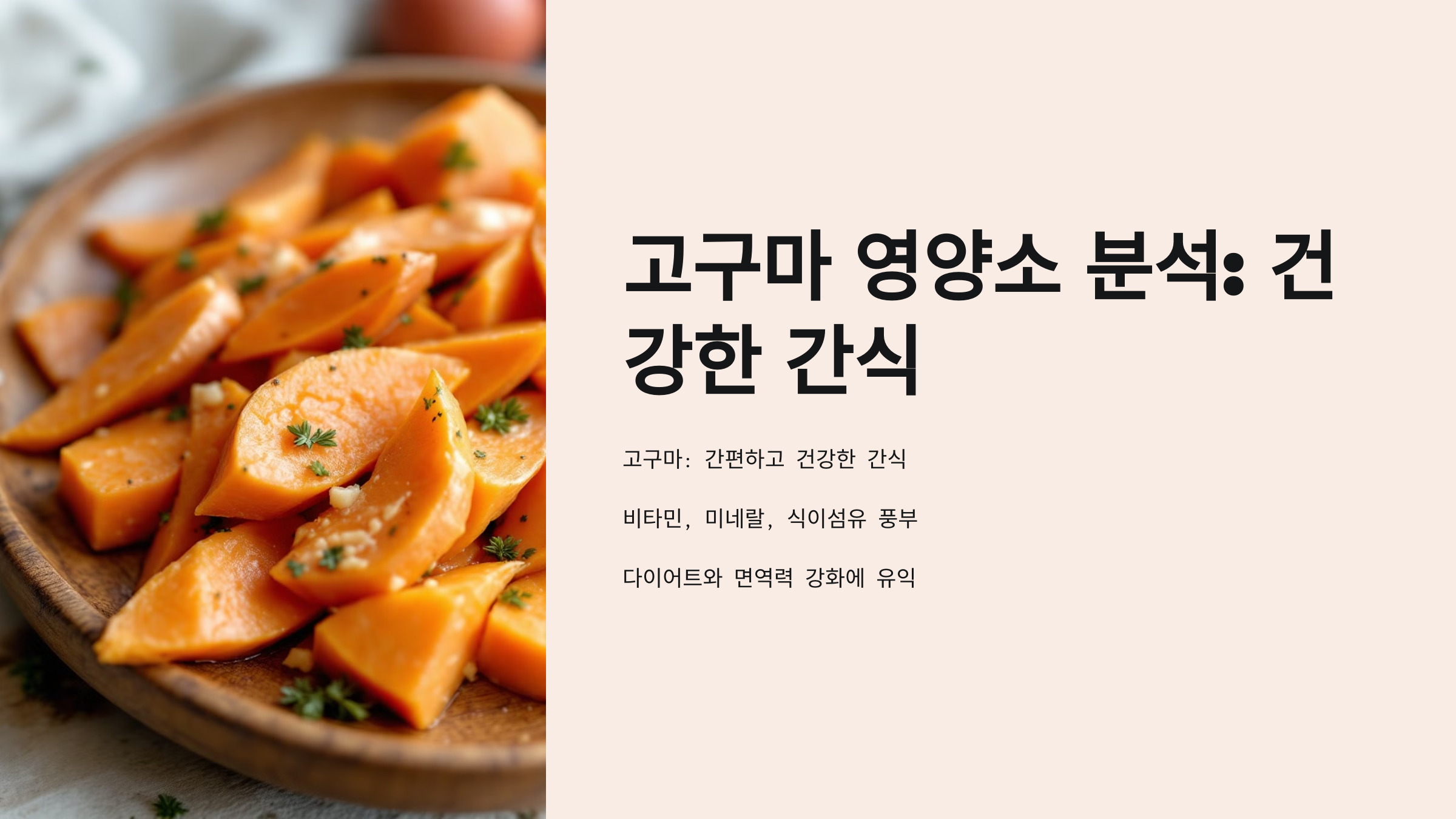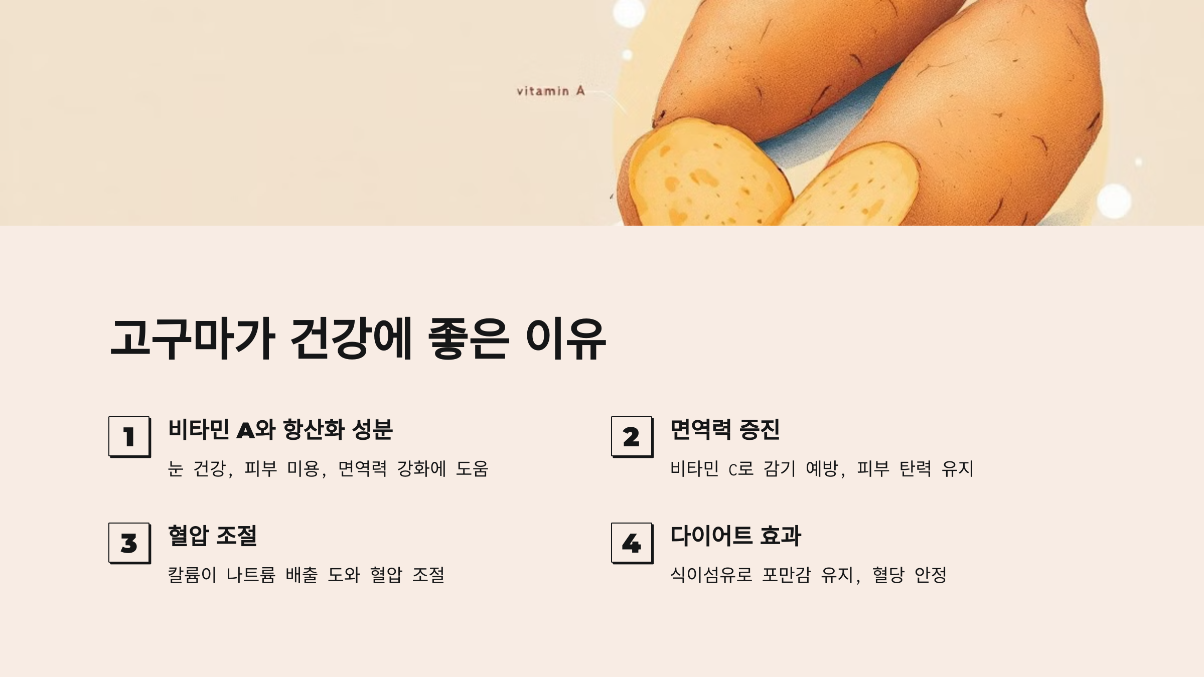 고구마는 맛과 영양을 모두 갖춘 간식으로, 건강을 생각하는 사람이라면 놓치기 아까운 식품입니다. 다양한 영양소가 고르게 포함되어 있어 눈 건강, 면역력 강화, 다이어트 등 여러 방면에서 유익하며, 특히 포만감이 높아 다이어트에도 효과적입니다. 간단하게 조리해 즐길 수 있고, 맛있으면서도 건강한 간식을 찾고 있다면 고구마만한 선택이 없습니다. 🍠😊
