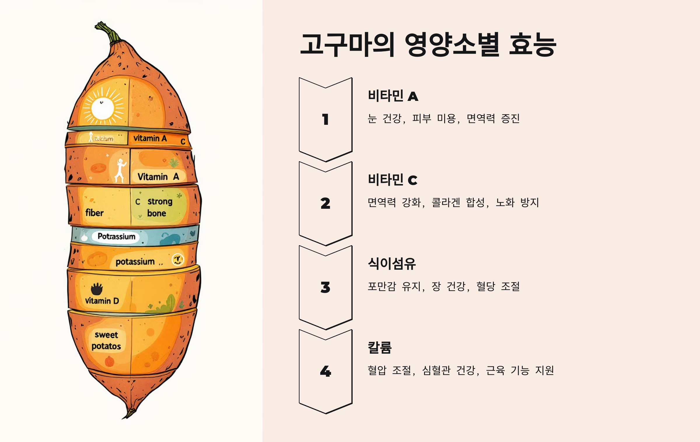 고구마는 비타민과 항산화 성분이 풍부해 다방면으로 건강에 긍정적인 영향을 줍니다. 그 대표적인 효과는 다음과 같습니다.