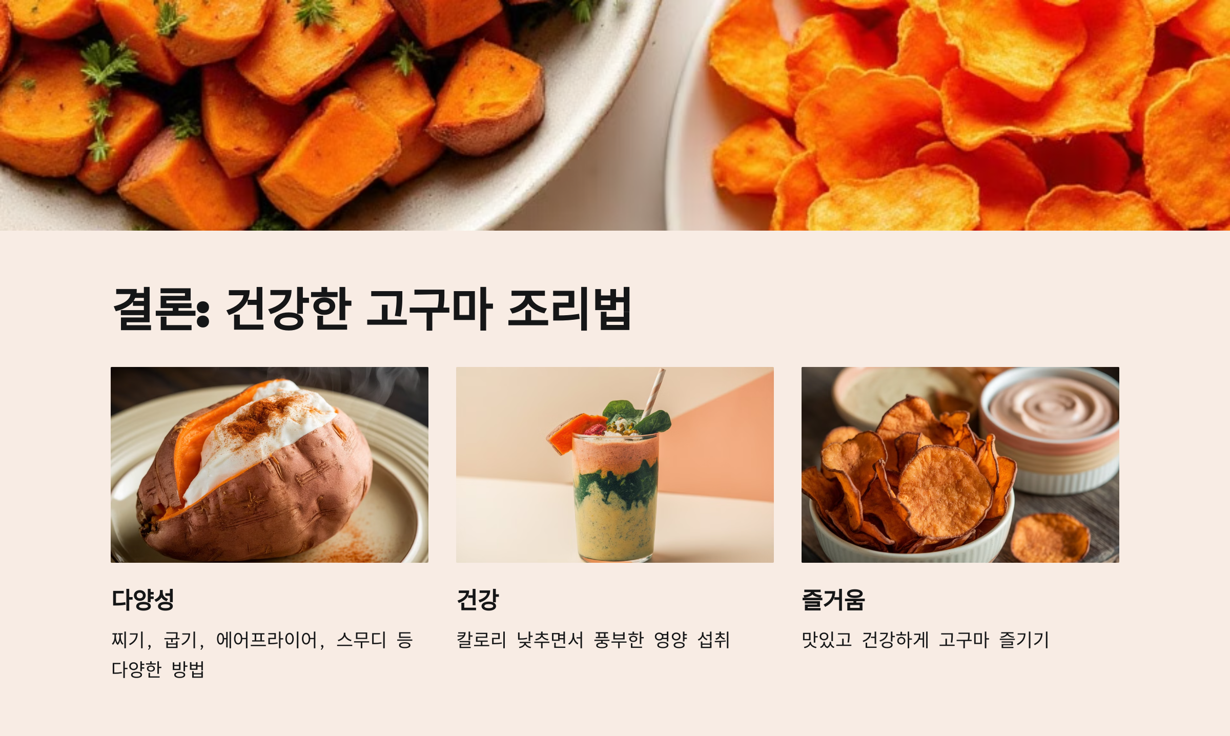 고구마는 다양한 조리법을 통해 건강하게 즐길 수 있습니다. 쪄서 먹거나 구워서 먹는 기본 조리법부터, 오일 없이 에어프라이어를 활용하거나 스무디로 즐기는 방법 등으로 칼로리를 낮추면서도 풍부한 영양을 섭취할 수 있습니다. 고구마를 더욱 맛있고 건강하게 즐겨보세요! 😊