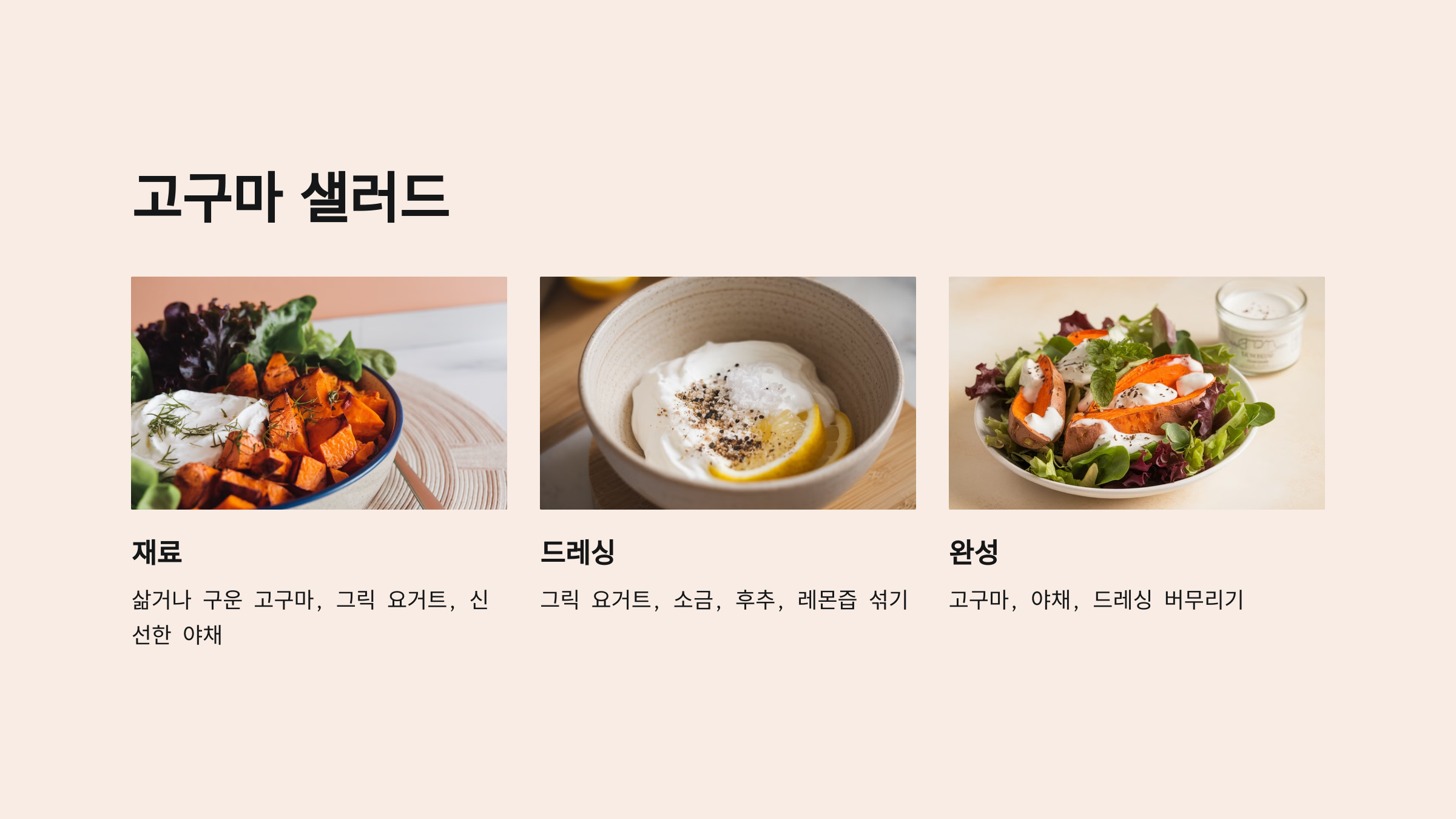 - 고구마와 신선한 야채, 드레싱을 함께 버무려 샐러드로 완성합니다.