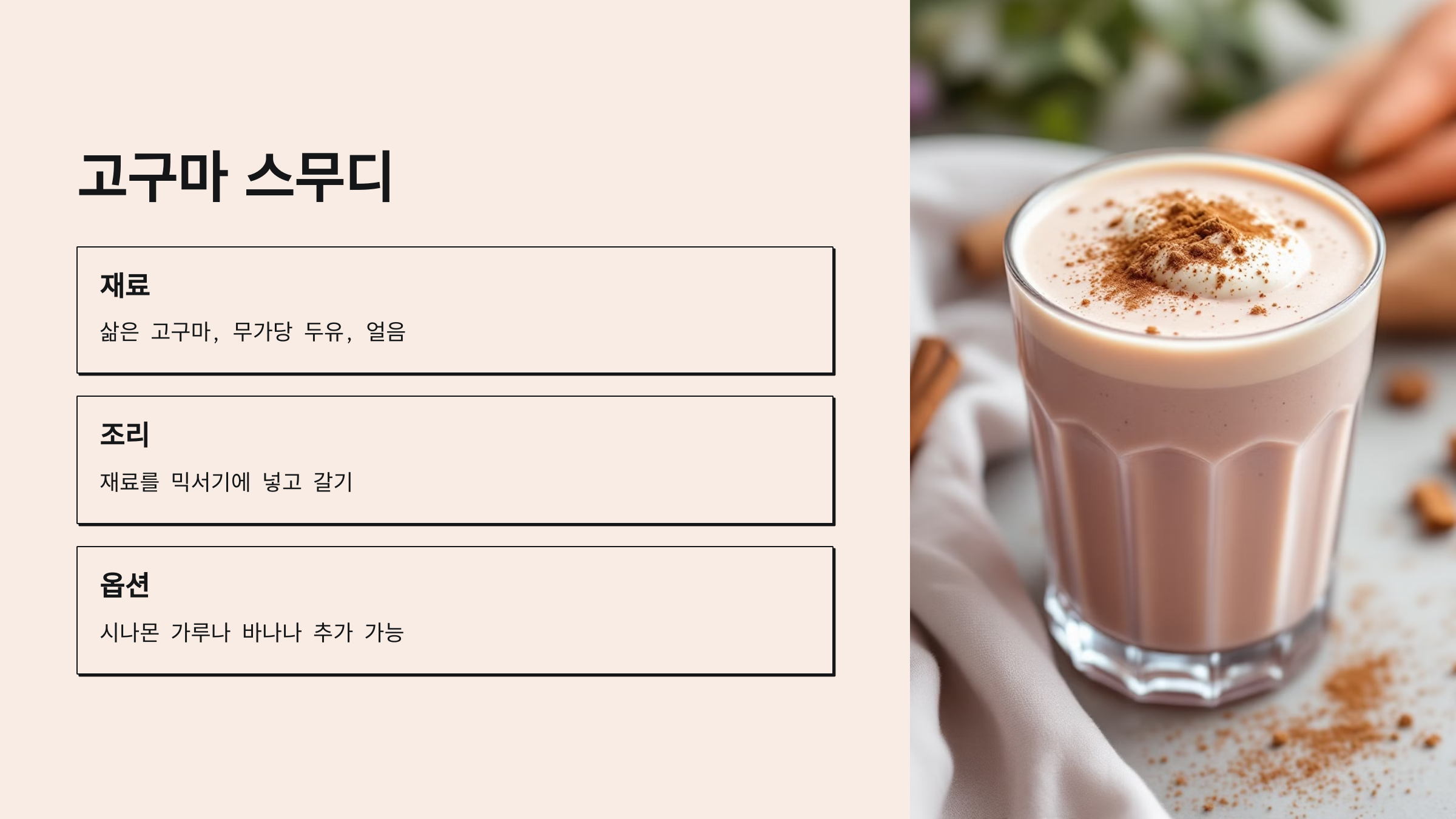 TIP: 고구마 스무디는 포만감이 높아 아침 대용으로도 좋습니다. 또한 식이섬유가 풍부해 소화에도 도움이 됩니다.