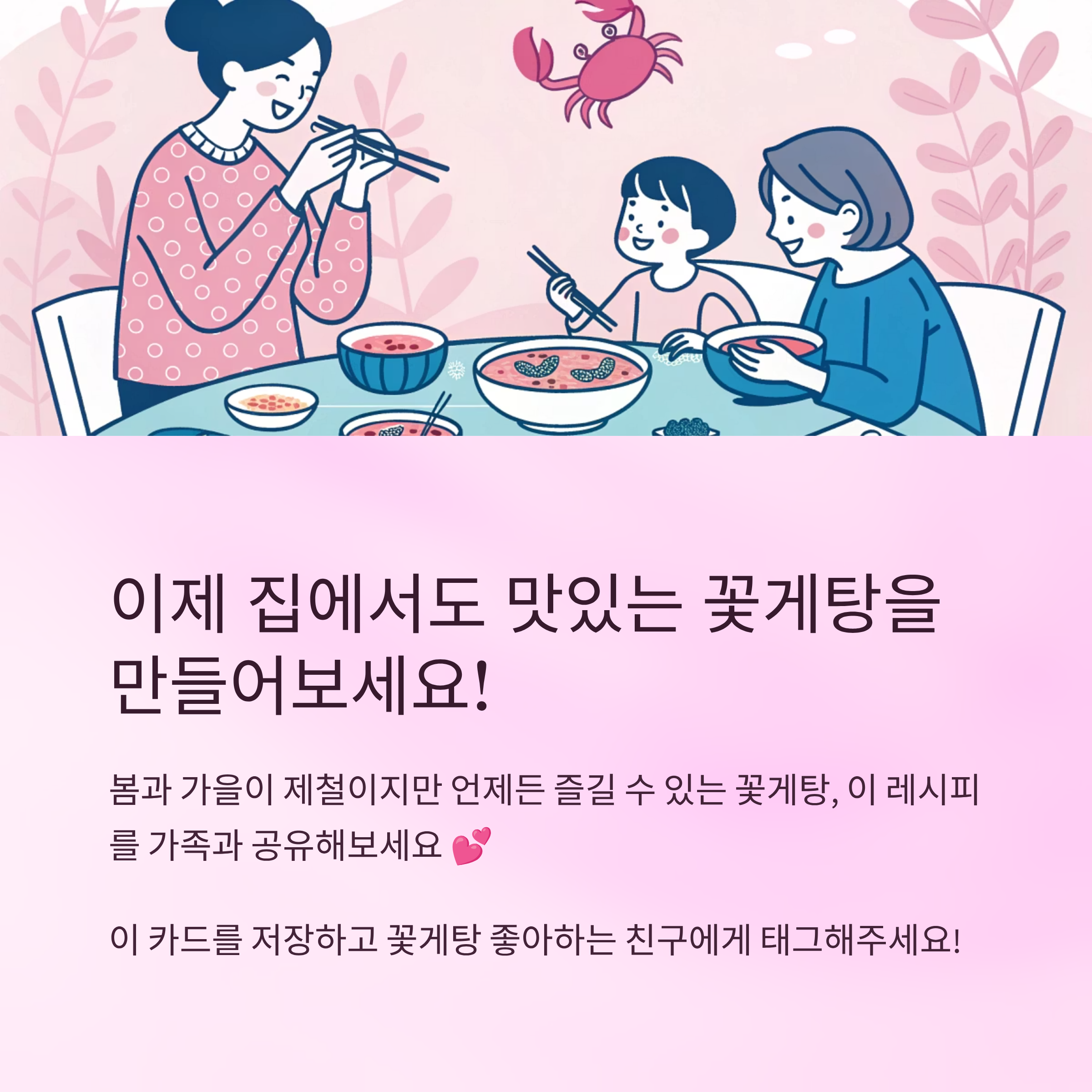 요즘은 마트에서도 냉동 꽃게를 쉽게 구할 수 있어 계절에 상관없이 끓일 수 있지만, 제철 꽃게는 그 향과 단맛이 훨씬 뛰어나요. 집에서도 그 맛을 최대한 살리는 법을 알면, 평범한 날도 특별한 식사가 된답니다.