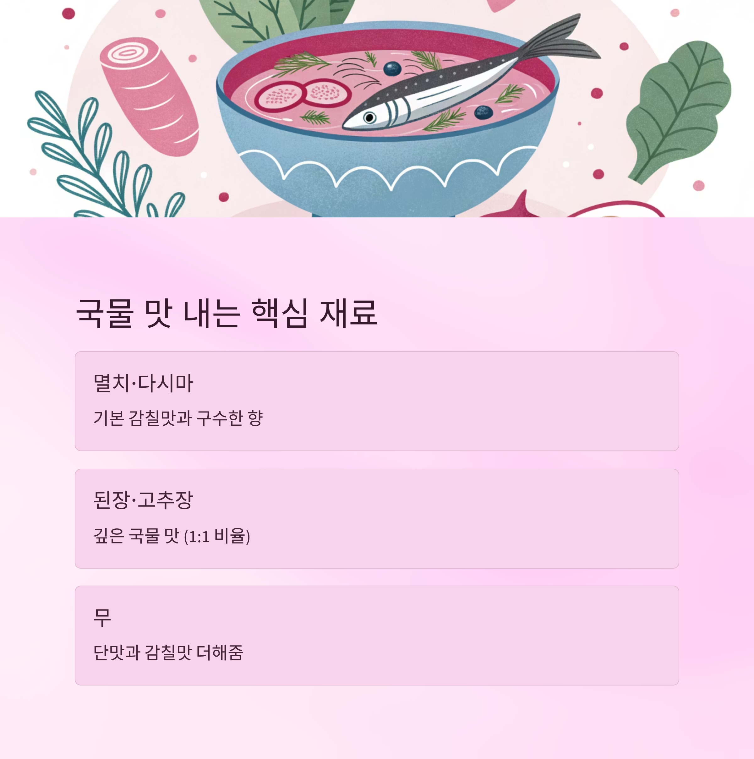 | 된장 | 깊은 국물 맛 | 고춧가루와 비율 맞추기 |