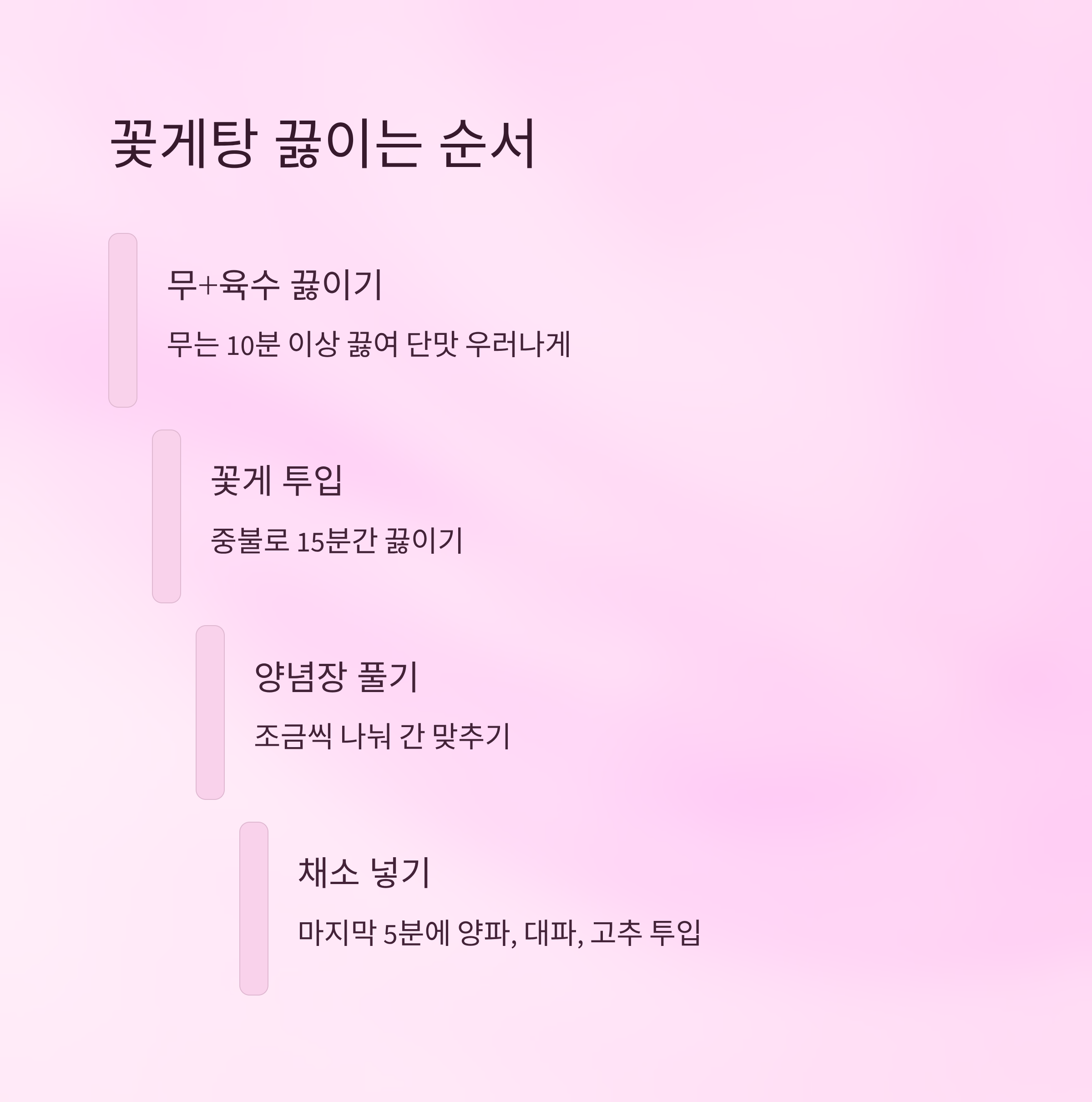 이제 꽃게탕의 뼈대를 완성했으니, 본격적으로 끓이는 순서를 알아볼 차례예요! 다음 단계에서는 전체 조리 순서를 하나하나 따라가 볼게요.