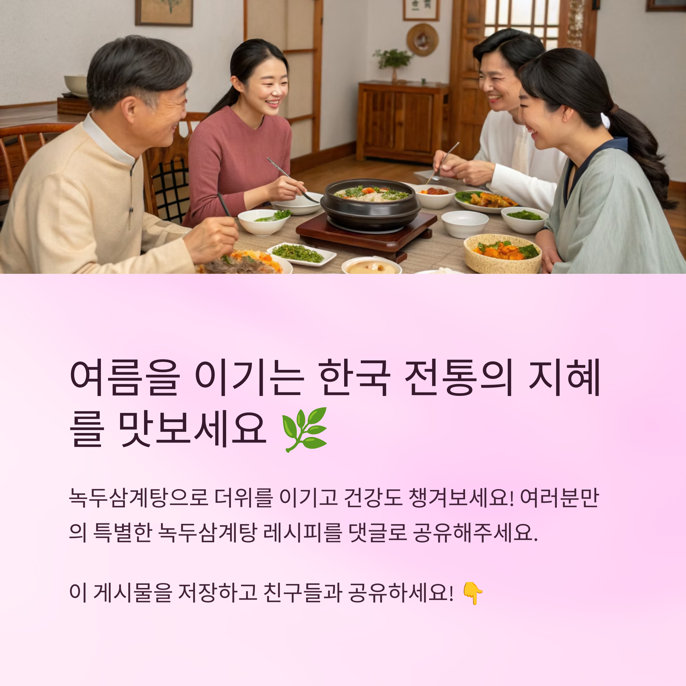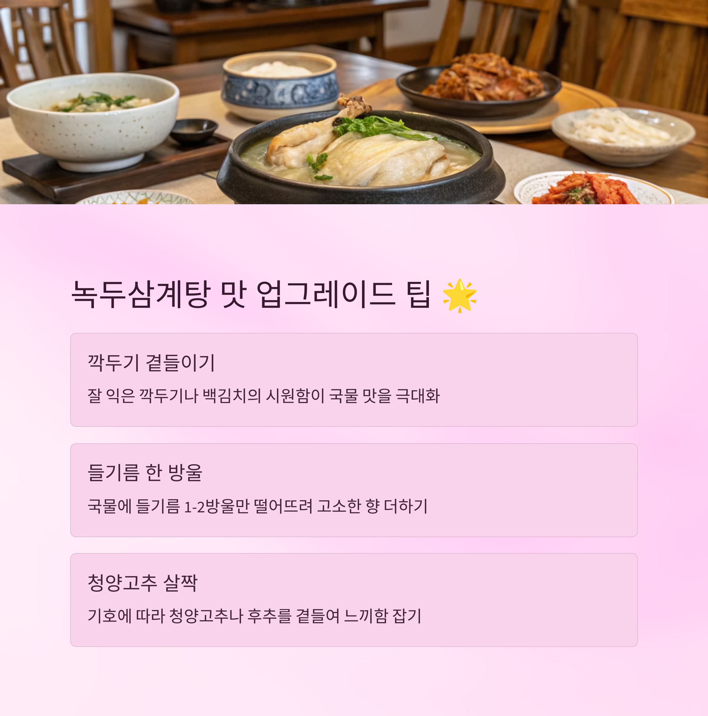 "내가 생각했을 때" 가장 큰 매력은 역시 담백함이에요. 일반 삼계탕이 느끼하게 느껴질 수 있는 반면, 녹두가 그 기름기를 잡아줘서 한 그릇 다 먹고도 속이 편하더라고요. 요즘은 아이들과 함께 먹는 가정식으로도 많이 선택되는데, 부담 없이 즐길 수 있어서 좋아요.