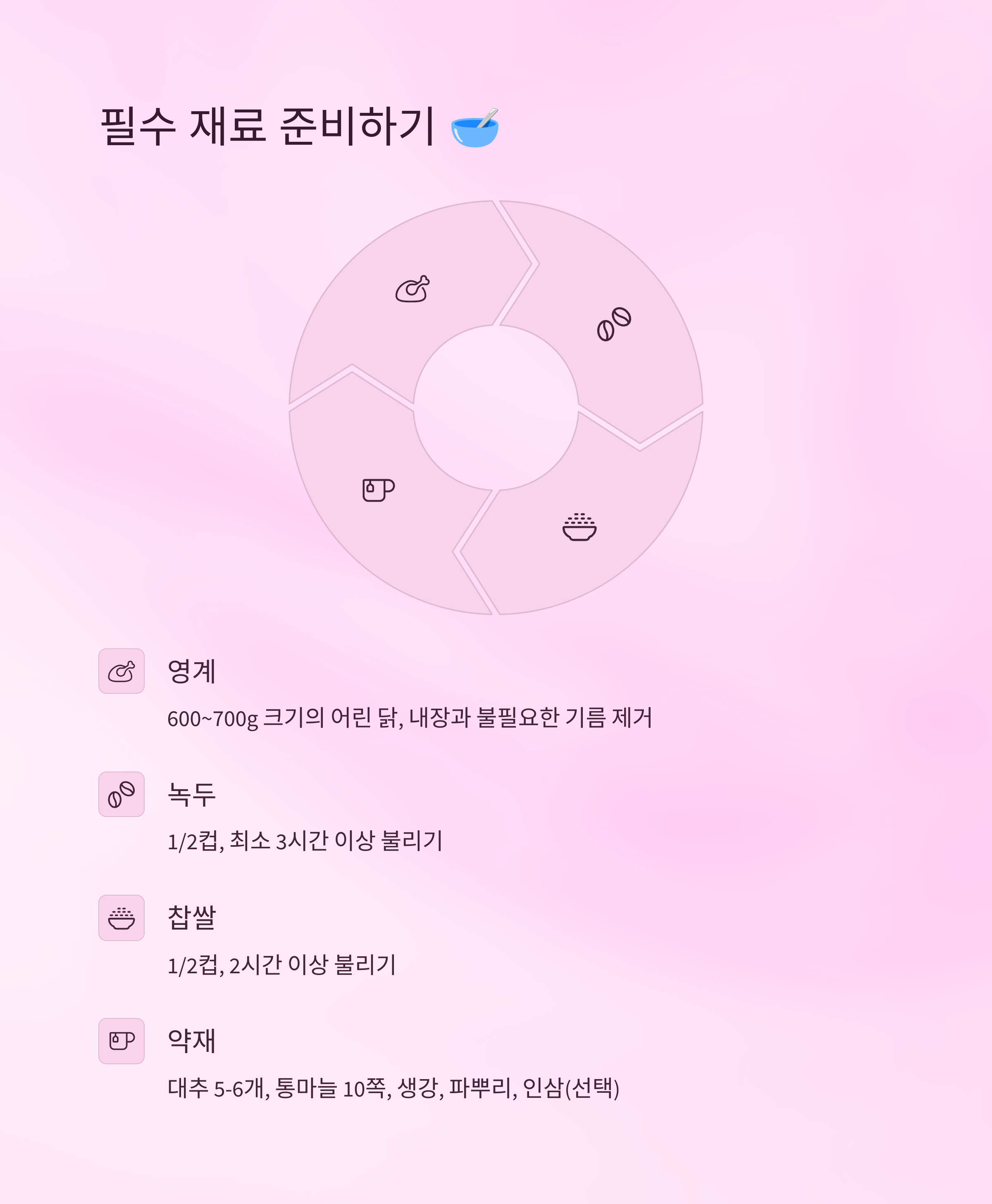 녹두는 미리 불려줘야 부드럽게 익어요. 최소 3시간 이상 물에 담가두면 조리 시간이 줄어들고 식감도 한층 부드러워져요. 대추는 깨끗이 씻고 꼭지를 제거하고, 마늘은 통마늘로 사용하는 것이 향을 살리는 데 좋아요. 인삼이나 황기 같은 한약재는 취향에 따라 넣어도 되고 생략해도 괜찮아요.