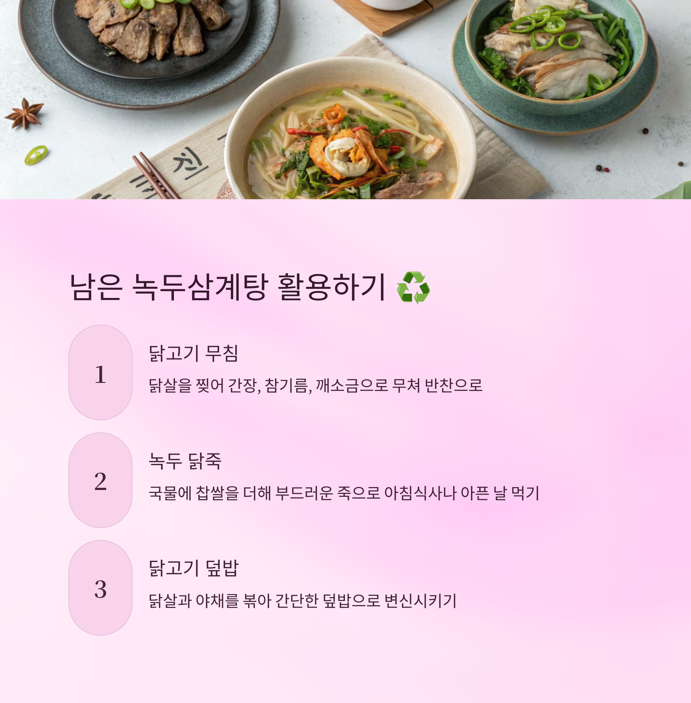 이처럼 녹두삼계탕은 그 자체로도 훌륭하지만, 남은 재료도 충분히 가치 있게 활용할 수 있어요. 음식 하나도 알차게 활용하면 생활의 만족도가 확 올라가요! 😊