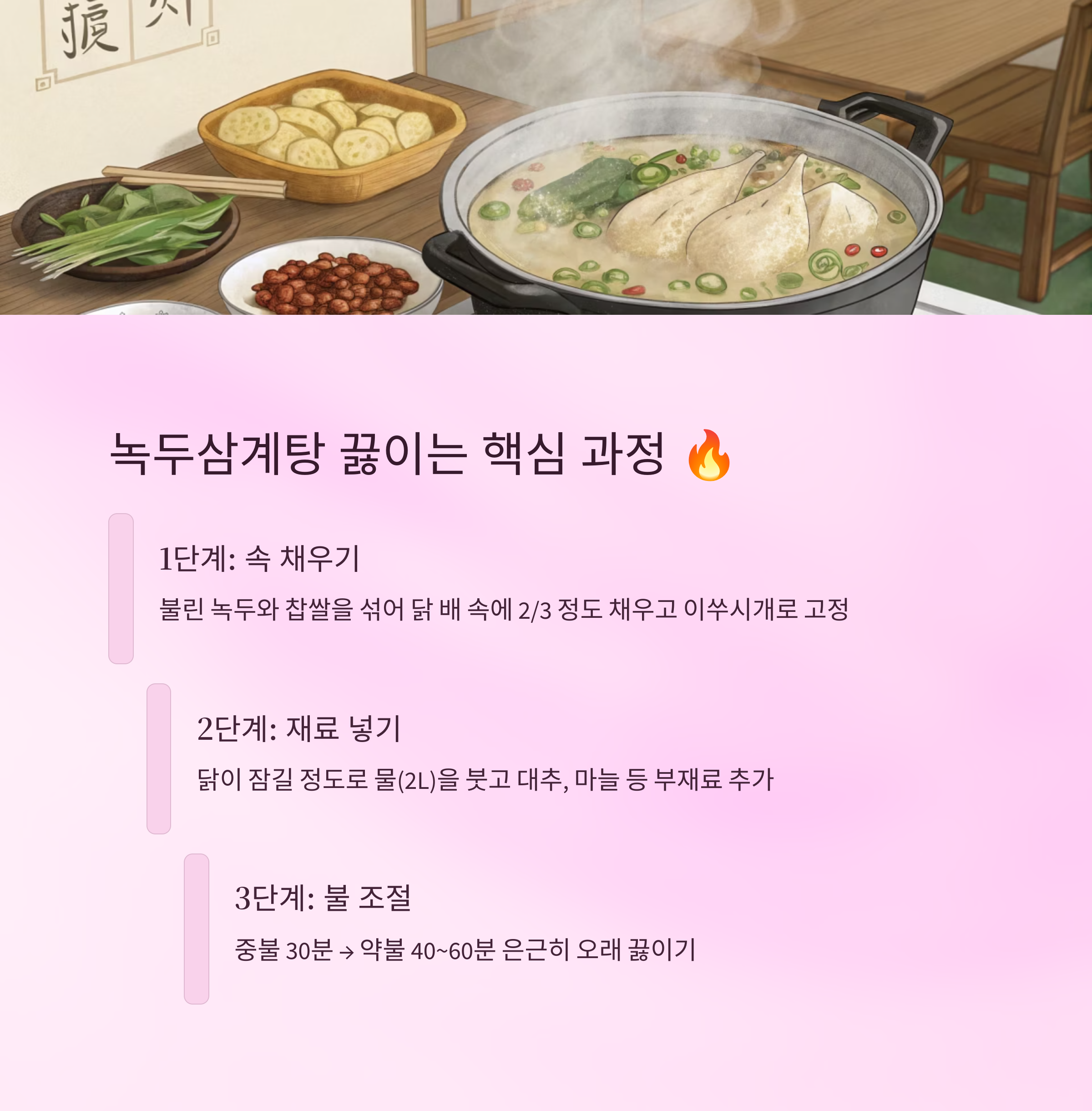 | 1. 속재료 채우기 | 불린 녹두+찹쌀 닭에 넣기 | 약 5분 |