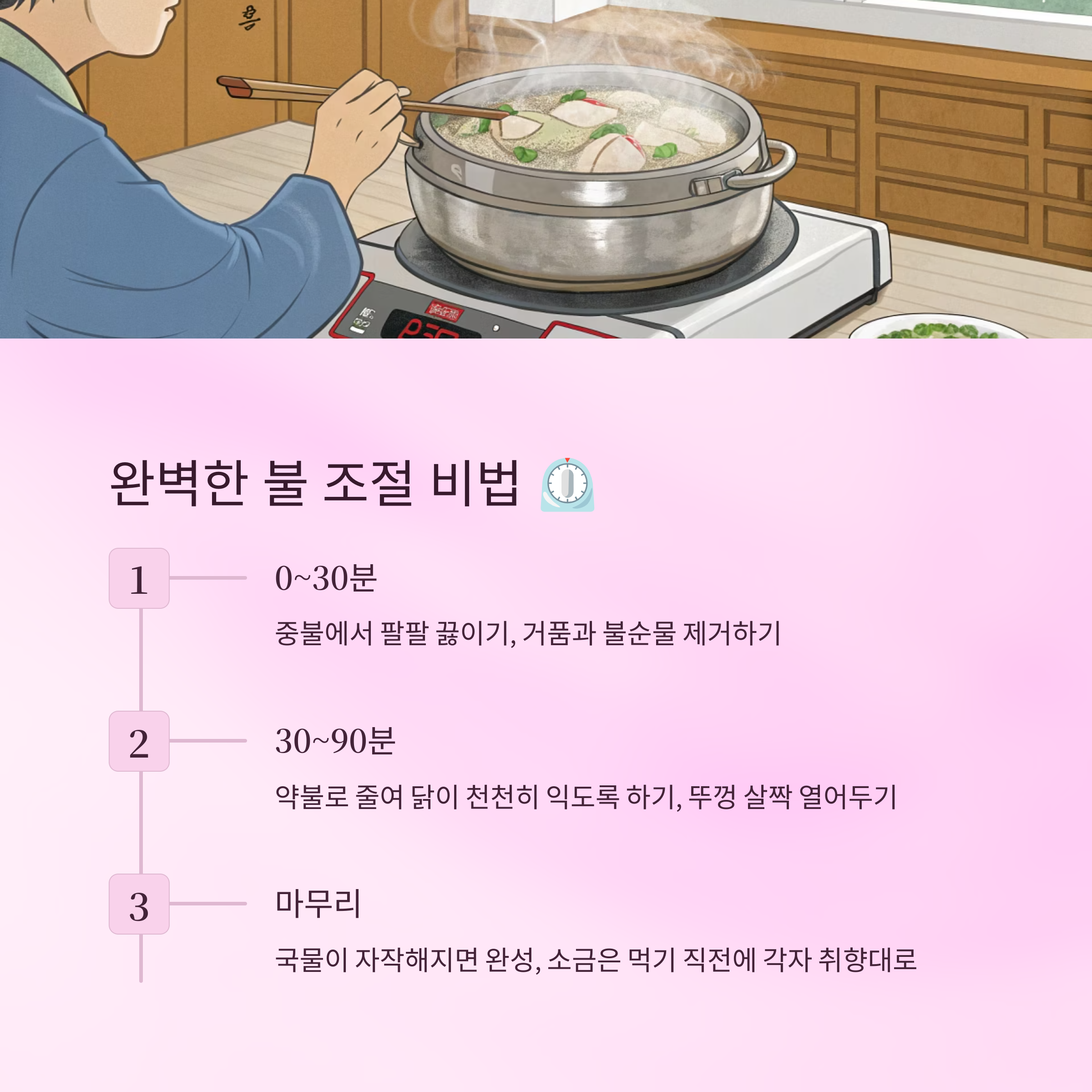 | 3. 불 조절 | 약불로 은근하게 끓이기 | 40~60분 |