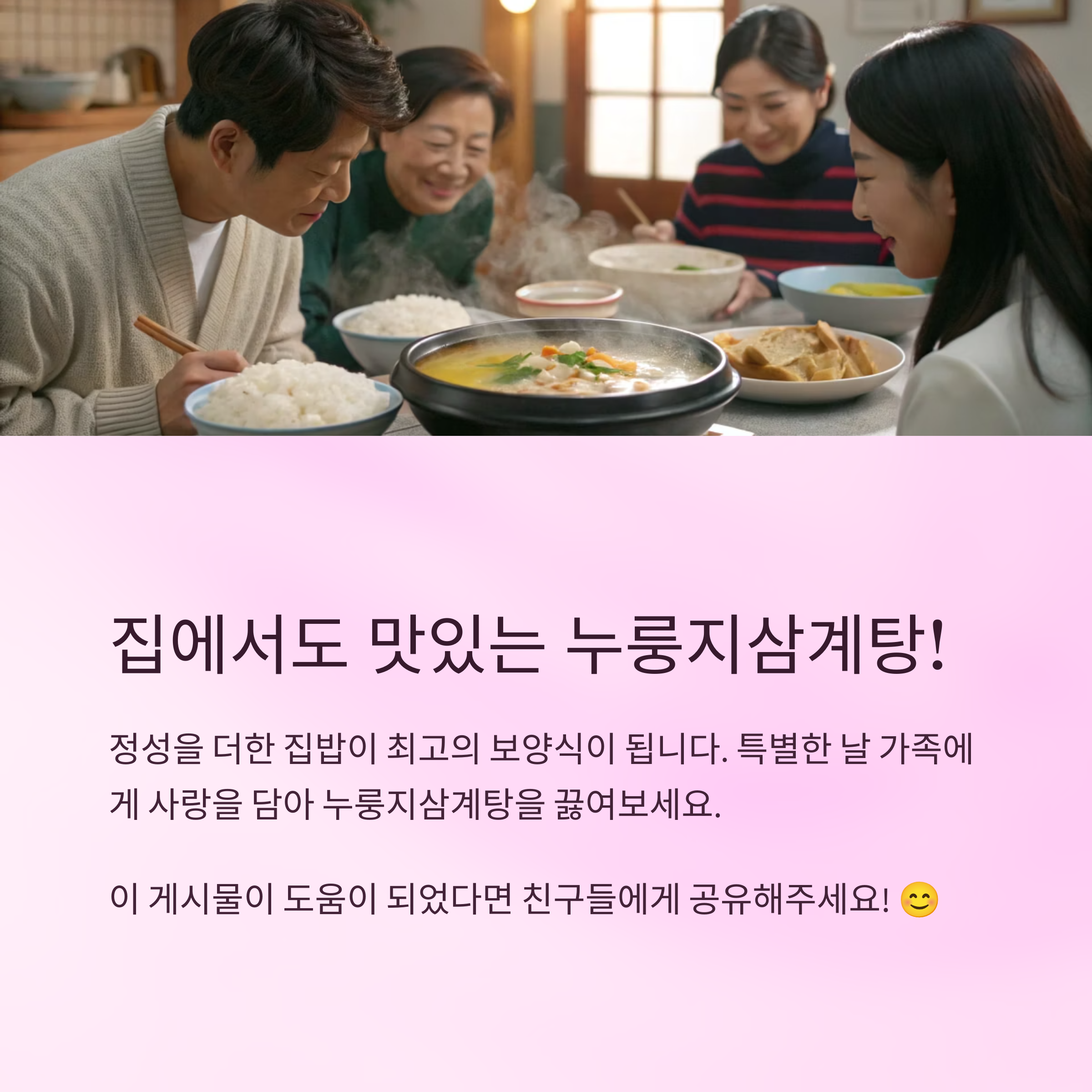 특히 요즘은 냉동 닭과 시판 누룽지로도 쉽게 만들 수 있어서 시간과 정성을 최소화하면서도 전통의 깊은 맛은 그대로 살릴 수 있어요. 재료만 제대로 준비되면 누구든 맛있는 누룽지삼계탕을 끓일 수 있어요.