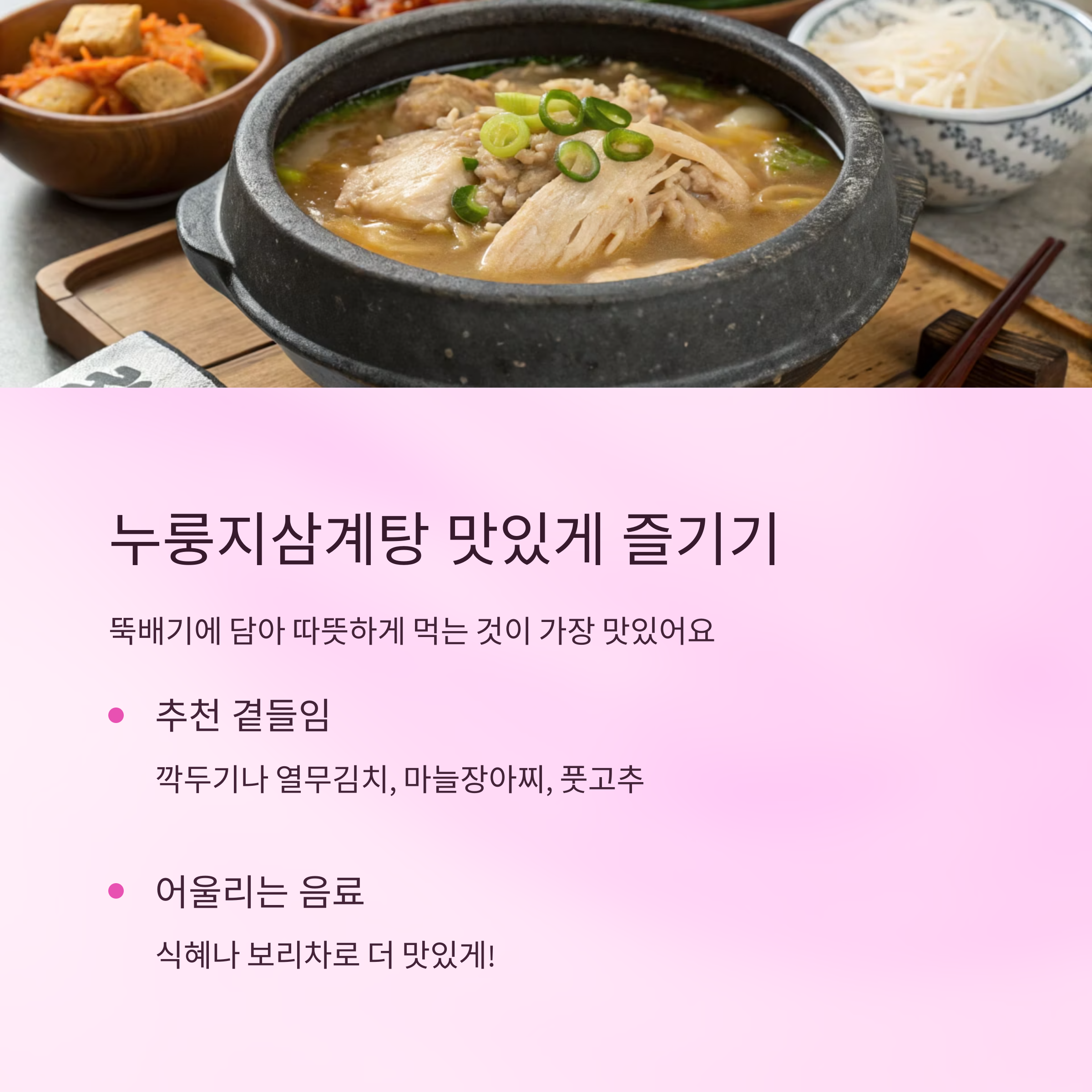 누룽지삼계탕은 뚝배기에 담아 따뜻하게 먹는 게 가장 맛있어요. 국물은 국자로 한 번 더 끼얹어가며 먹으면 구수한 누룽지 맛이 계속 퍼져요. 다 먹고 나면 바닥에 남은 누룽지까지 긁어 먹는 재미도 있답니다.