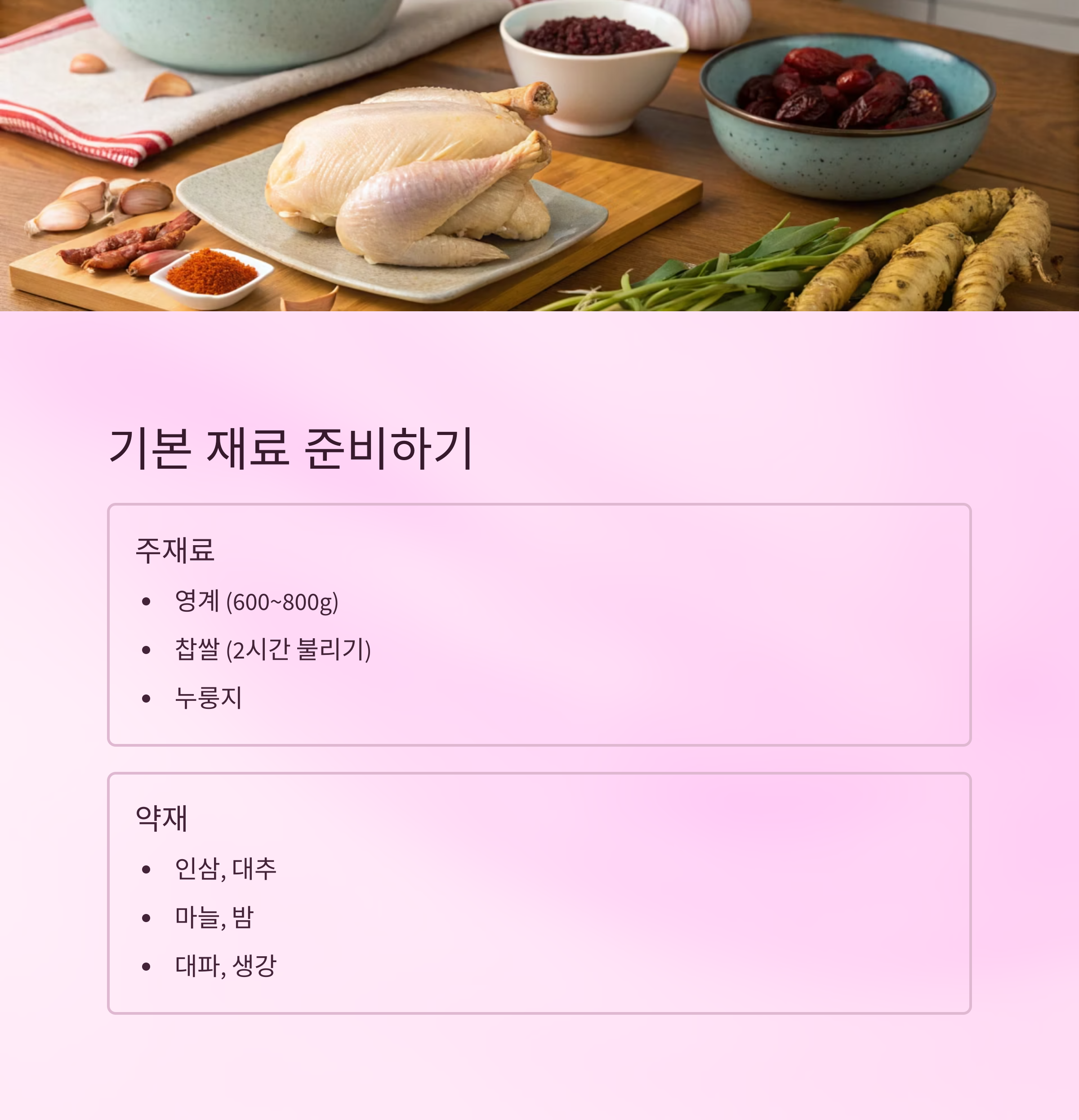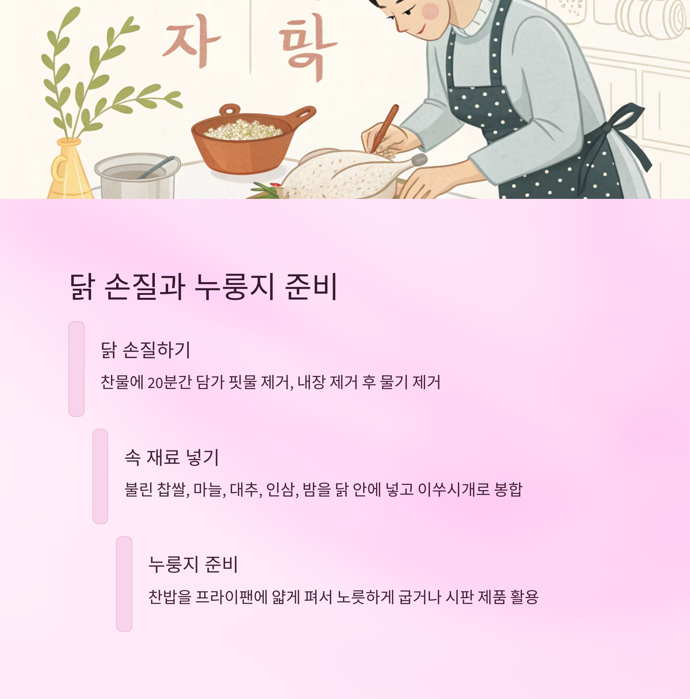 닭을 깨끗하게 씻은 뒤 내장을 제거하고 핏물을 뺄 필요가 있어요. 찬물에 20분 정도 담가두고 중간에 물을 한두 번 갈아주면 핏기가 잘 빠져요. 물기 제거 후 닭 안쪽에 불린 찹쌀, 마늘 2~3쪽, 대추, 인삼, 밤을 넣고 이쑤시개나 실로 봉합해요.