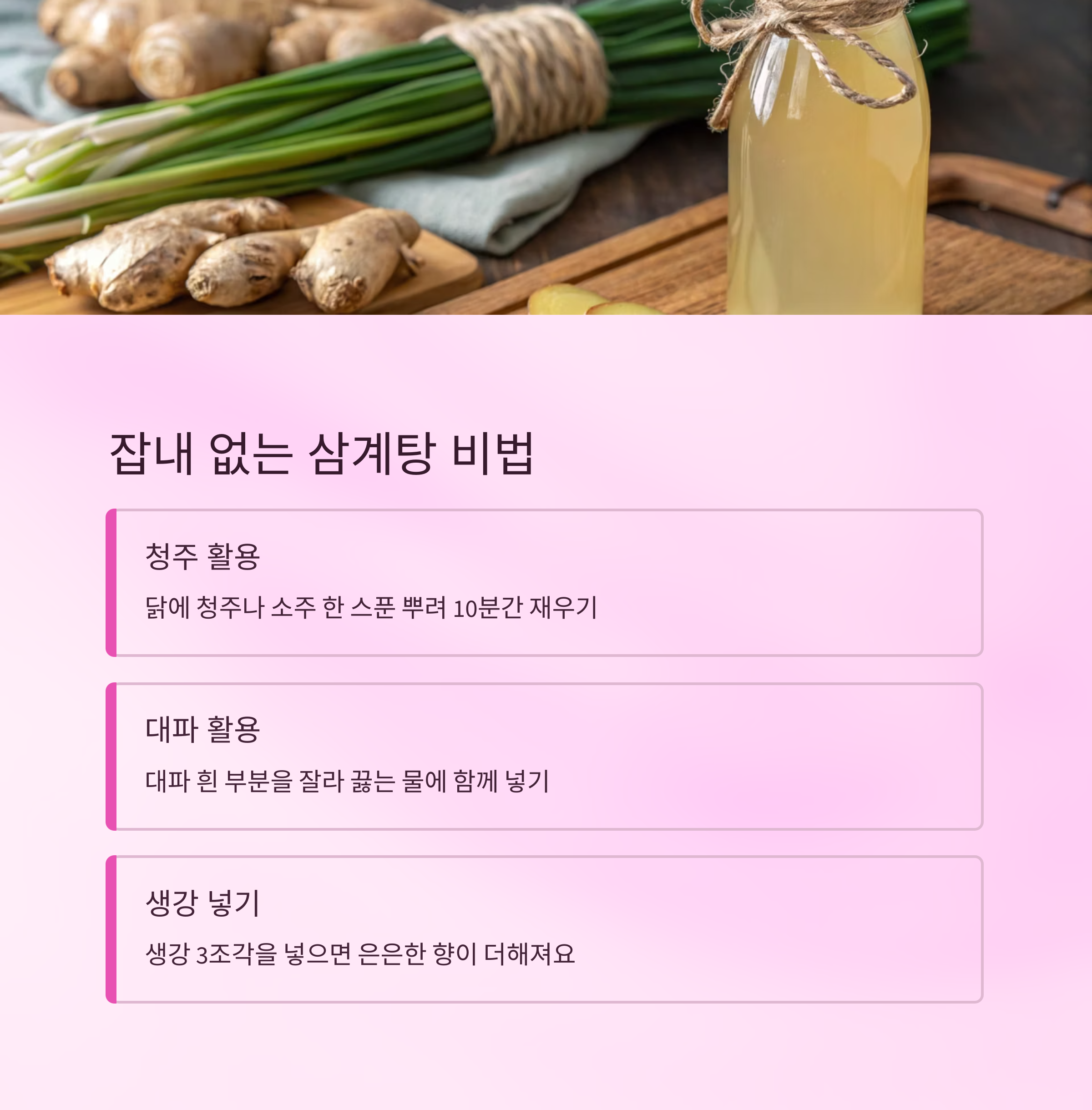 닭 특유의 냄새가 싫은 사람들을 위해 중요한 팁이에요. 닭을 삶기 전 청주나 소주 한 스푼을 닭에 뿌려 10분 정도 재워두면 누린내가 줄어요. 또는 대파의 흰 부분을 잘라 끓는 물에 같이 넣는 방법도 효과 있어요.