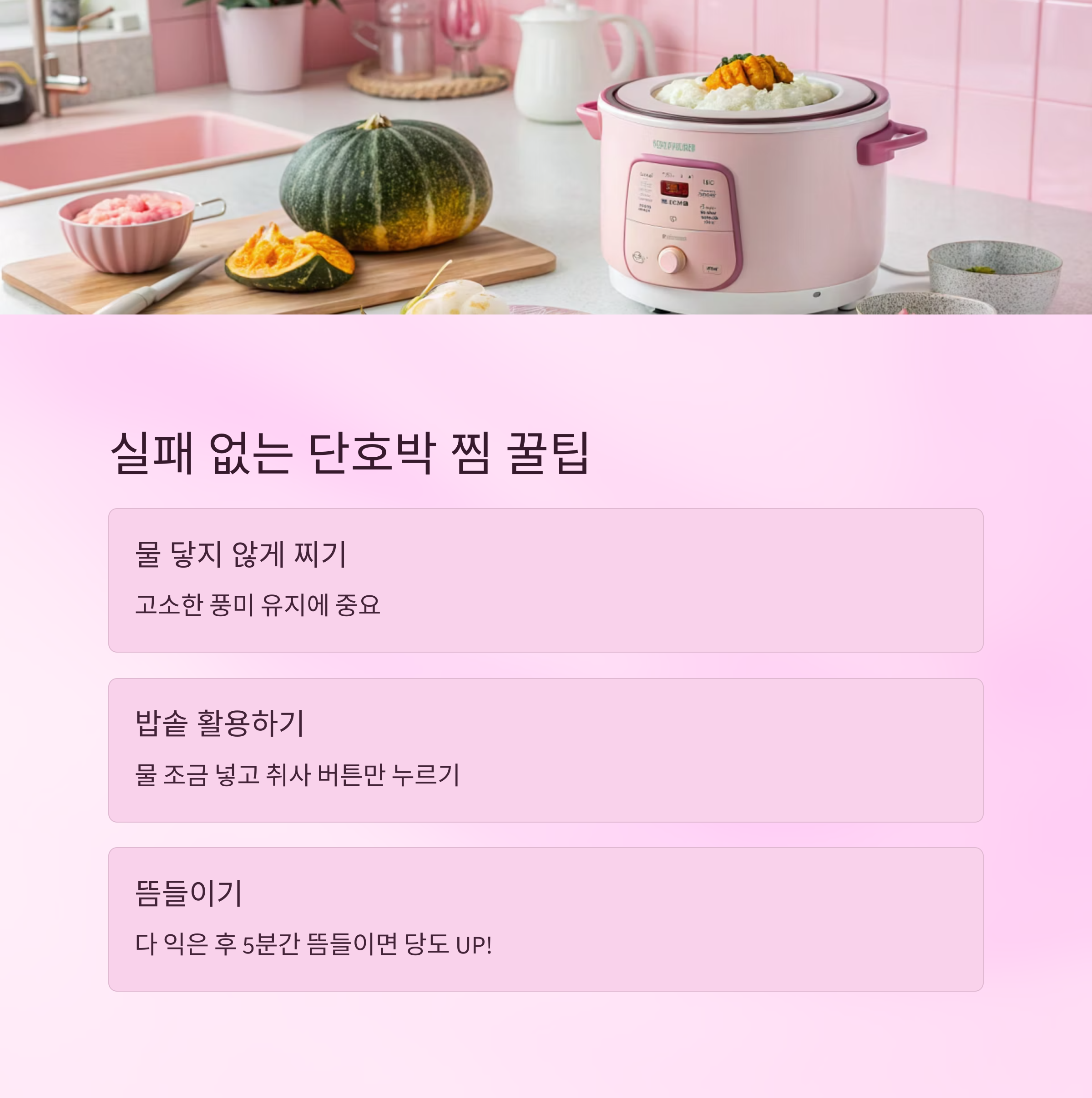 찐 단호박은 바로 꺼내기보다 뚜껑을 열지 않고 5분 정도 뜸을 들이는 게 좋아요. 잔열로 마무리 익힘이 되면서 훨씬 부드럽고 당도가 올라간답니다 🍯