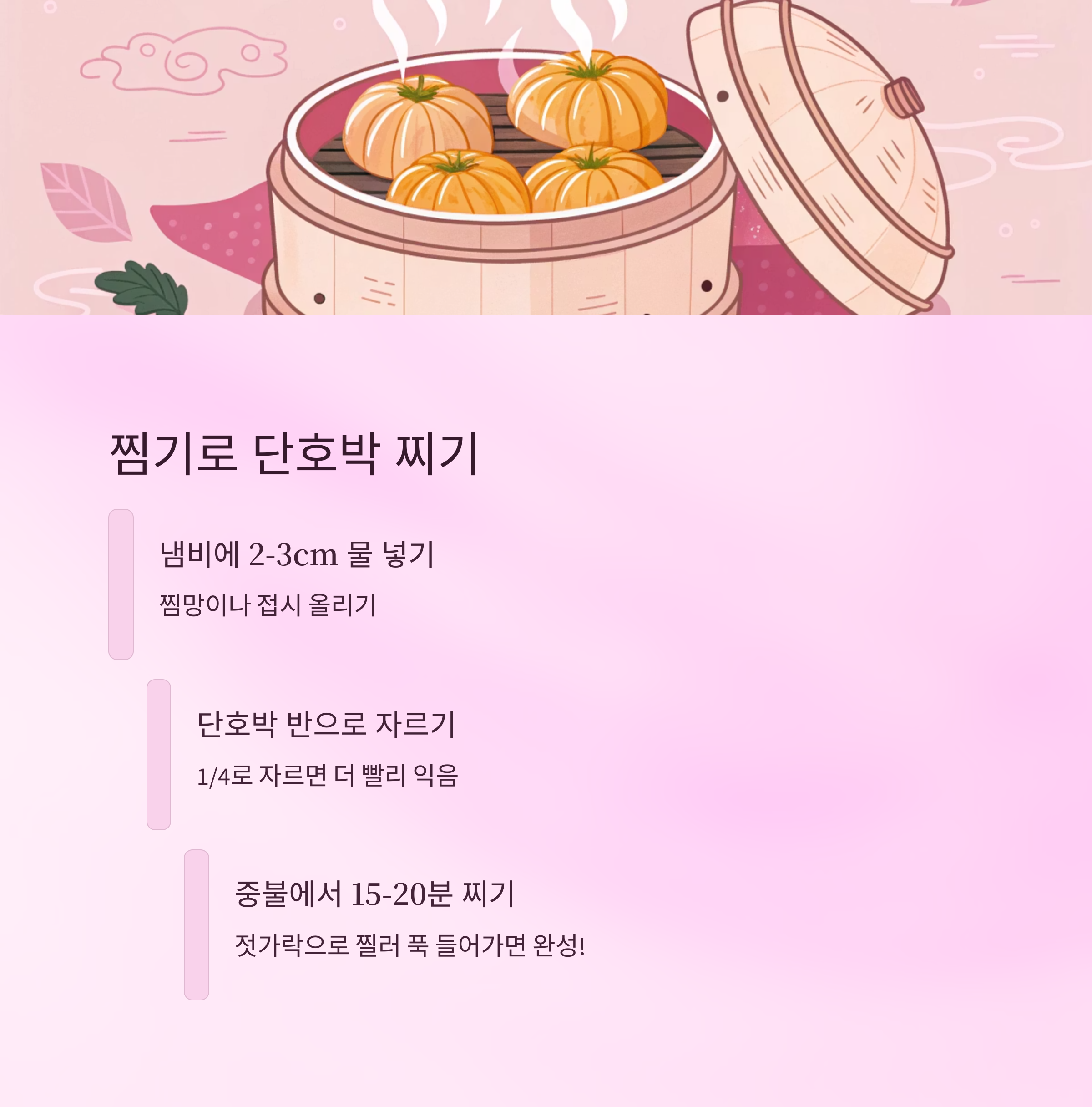 찜기로 찌는 방법은 가장 고전적이면서도 맛을 살리는 데 효과적이에요. 냄비에 찜망이나 접시를 올리고 2~3cm 정도 물을 넣은 후 단호박을 반으로 잘라 올려주세요. 중불에서 20분 정도 쪄주면 돼요.