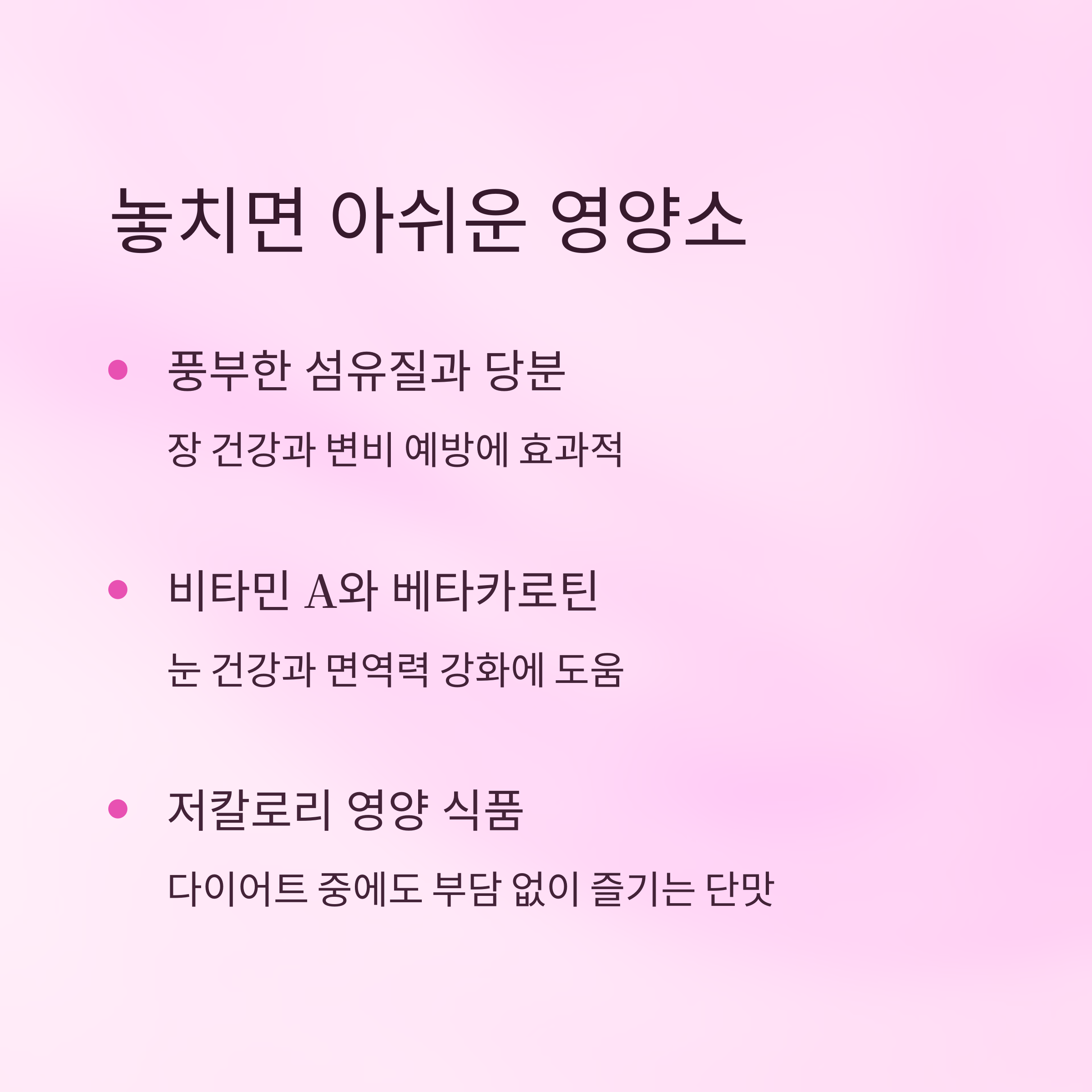 비타민 A와 베타카로틴이 풍부해서 눈 건강에도 좋아요. 특히 성장기 어린이에게 좋은 간식 재료로 활용하면 영양적으로도 든든해요. 항산화 효과로 면역력 강화에도 도움을 줄 수 있어요.