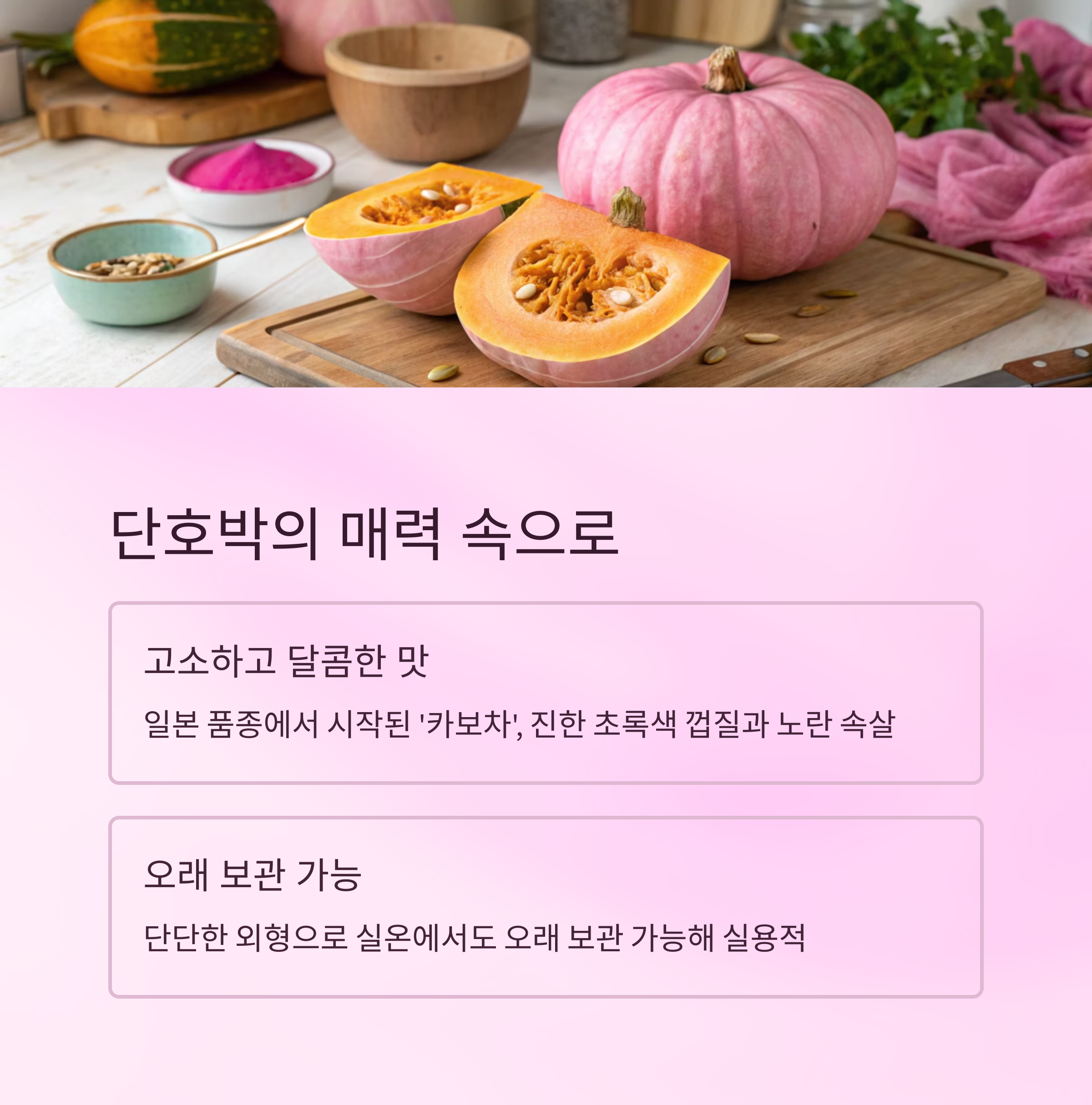 일본에서는 ‘카보차’라고 부르며, 이미 오래전부터 디저트나 반찬 등 다양한 요리에 활용되어 왔어요. 우리나라에도 1990년대 중반 이후로 널리 보급되었고, 현재는 다양한 국산 품종도 많이 재배되고 있어요.