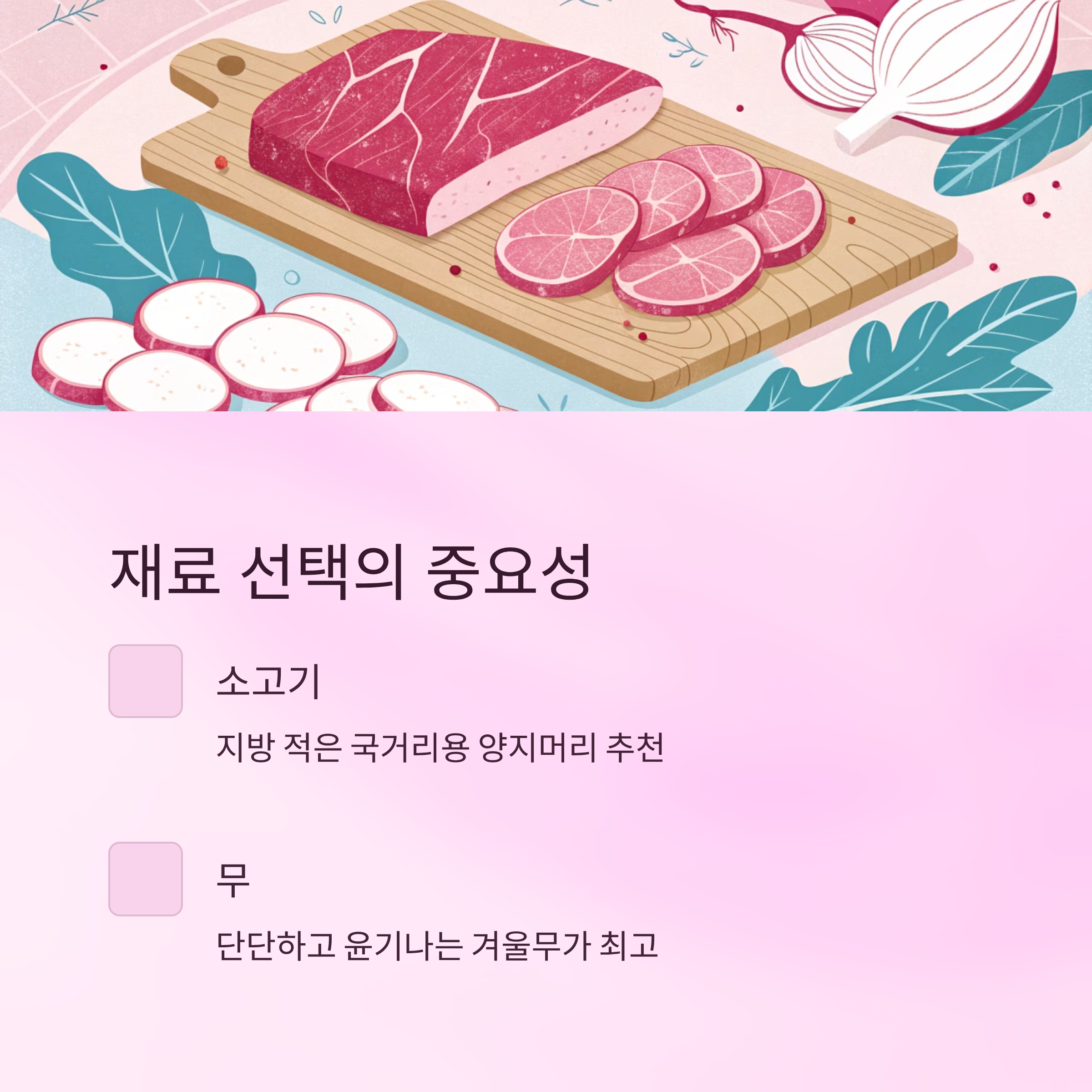 맑은 국물 요리일수록 재료 본연의 맛이 더 잘 느껴지기 때문에, 재료 선정이 아주 중요해요. 가장 기본은 소고기와 무지만, 이 두 가지의 질이 맛을 좌우한다고 해도 과언이 아니에요. 소고기는 국거리용으로 준비하되 지방이 너무 많지 않은 부위를 사용하는 게 좋아요.