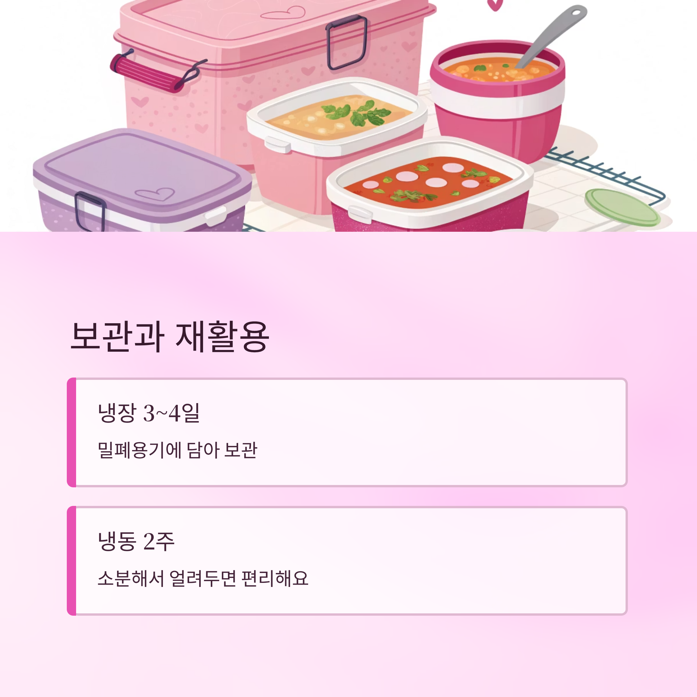 맑은 소고기무국은 끓인 후 하루 이상 보관해도 맛이 변하지 않아서, 대량으로 만들어 놓고 두고두고 먹기 좋아요. 식힌 후 밀폐 용기에 담아 냉장 보관하면 3~4일은 무난하고, 냉동보관 시에는 2주까지도 가능해요. 다만, 무가 너무 익어 흐물거리기 전에 먹는 걸 추천해요.