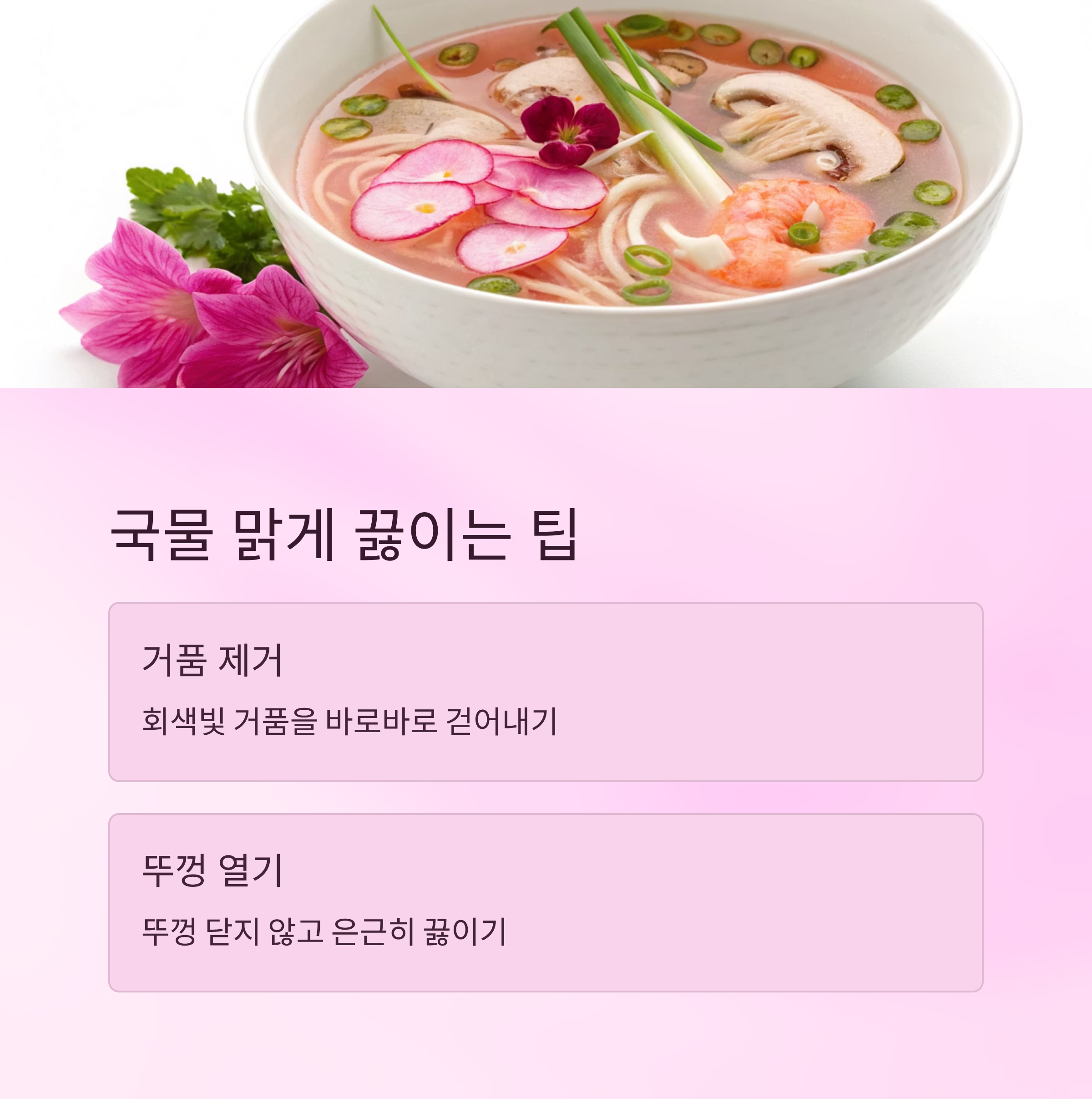 또한, 뚜껑을 덮지 않고 끓이는 것도 팁이에요. 뚜껑을 닫으면 내부 증기가 다시 물에 섞이면서 국물이 탁해질 수 있어요. 약불~중불로 은근히 끓이면 깔끔한 맛이 더 살아나요. 국간장은 국물 색을 어둡게 하지 않으면서도 감칠맛을 내주기 때문에 꼭 활용해보세요.