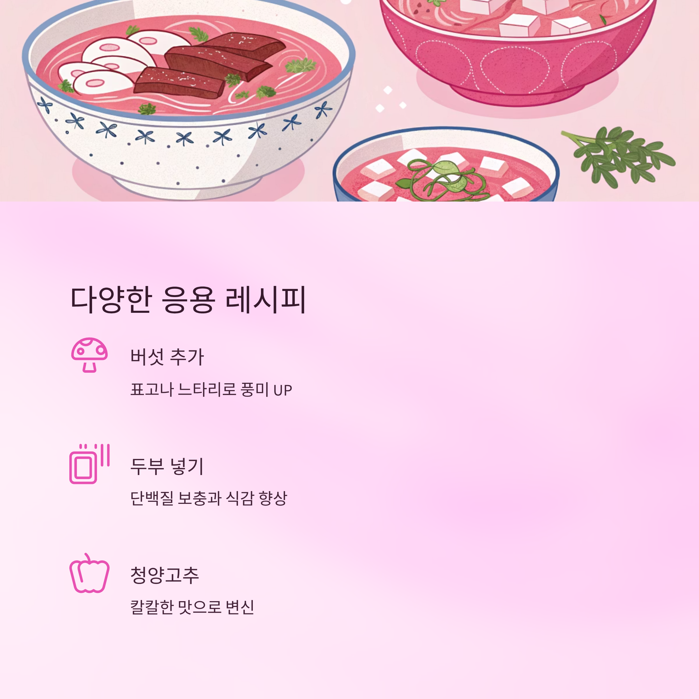 맑은 소고기무국은 기본이 되는 국물요리이지만, 다양한 재료를 활용해 새로운 메뉴로 확장할 수 있어요. 예를 들어, 표고버섯이나 느타리버섯을 추가하면 풍미가 더욱 깊어지고, 매생이나 미역을 넣으면 해물 느낌까지 낼 수 있어요. 입맛 없을 때 아주 유용하죠.