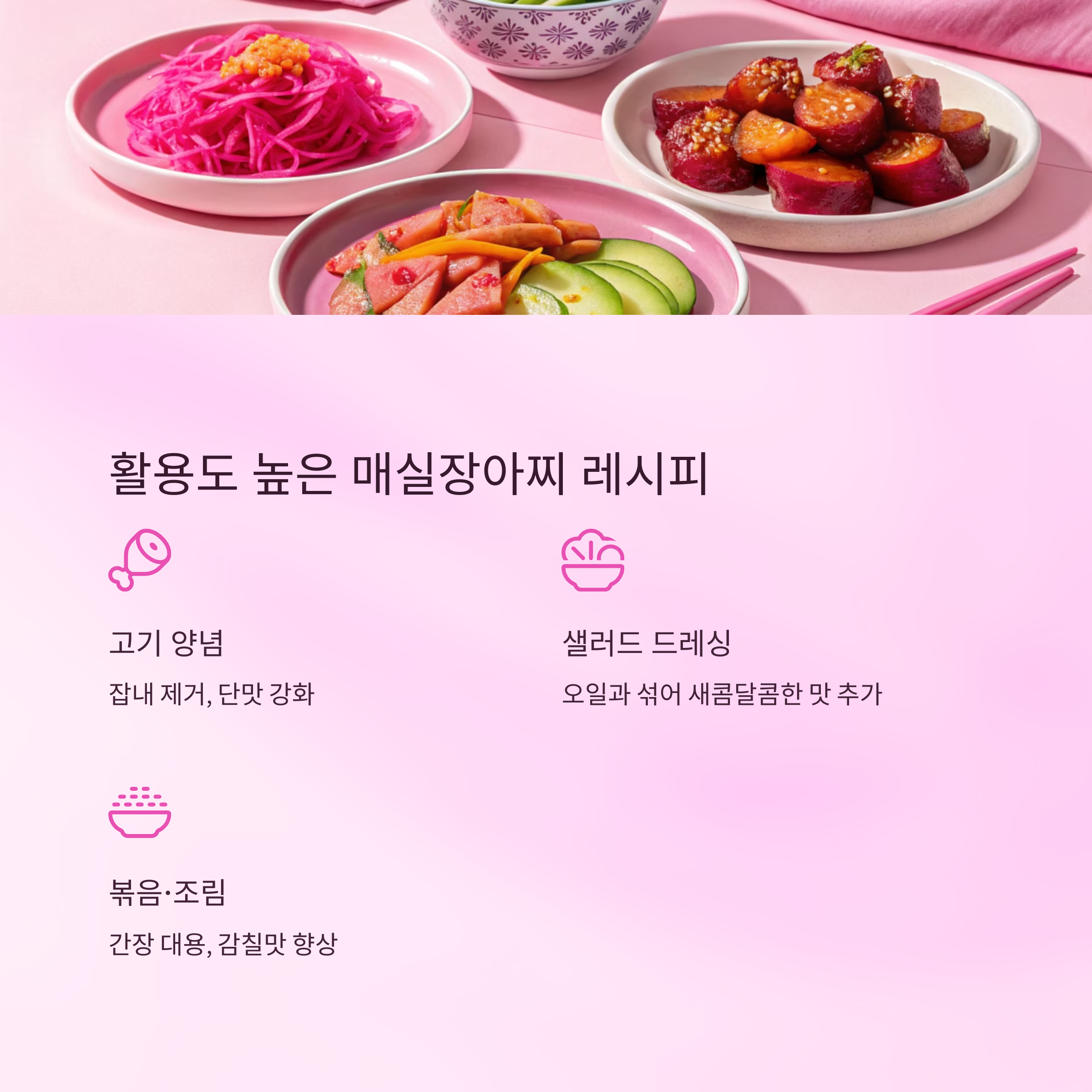 | 샐러드드레싱 | 장아찌즙, 다진 매실 | 오일·식초와 섞어 사용 |